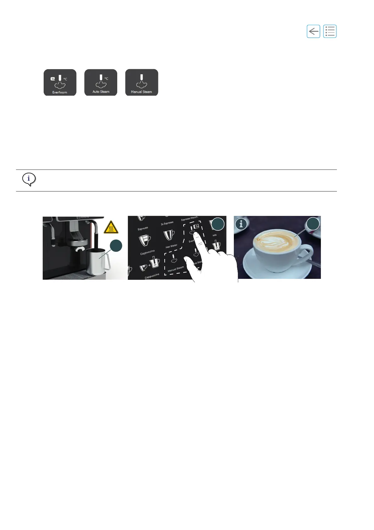 D. Press one of the steam buttons (2) to dispense a steam product (e.g. to make milk foam or coffee art