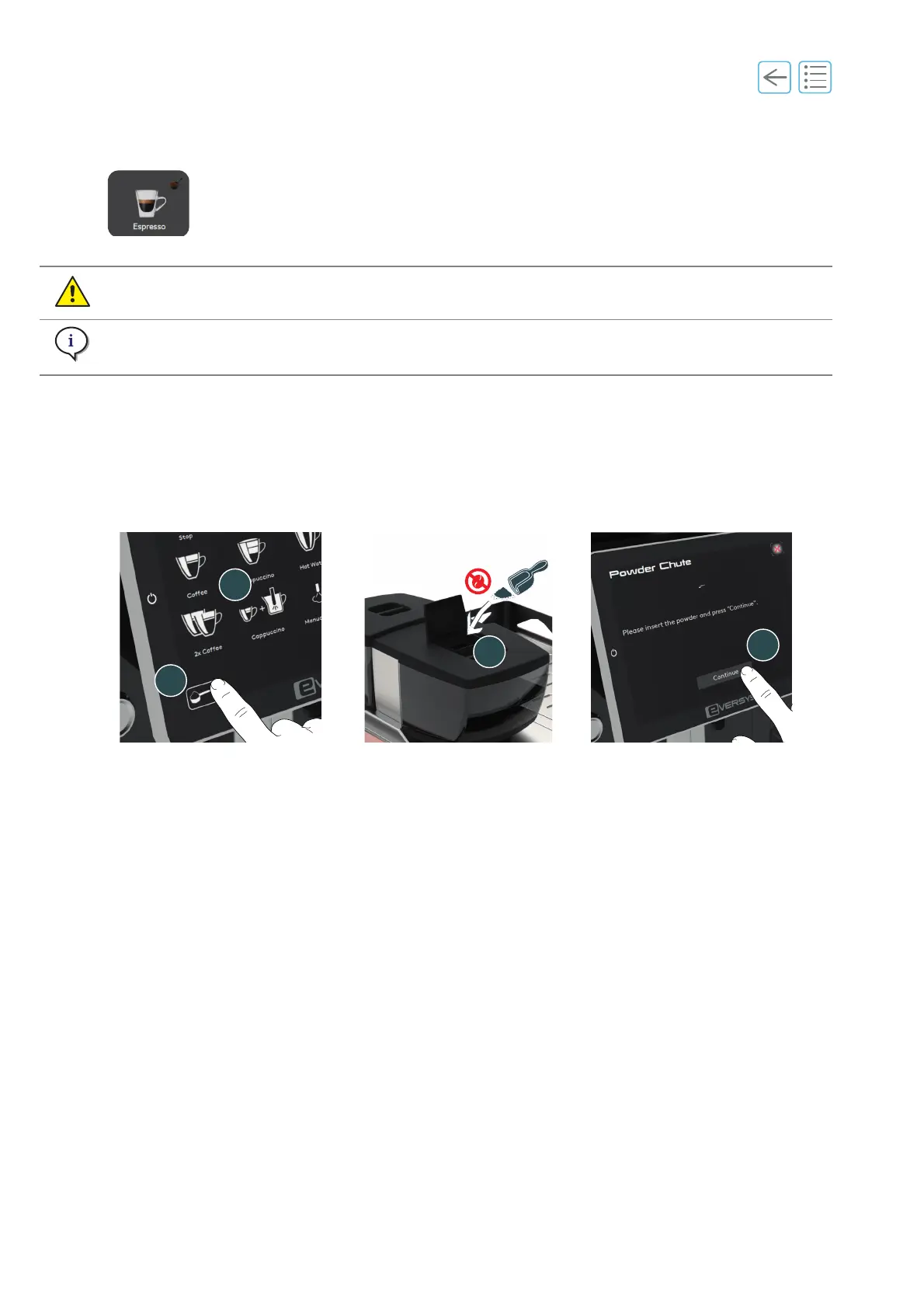 D. Close the powder chute lid (3) and press Continue (4) to dispense the product.