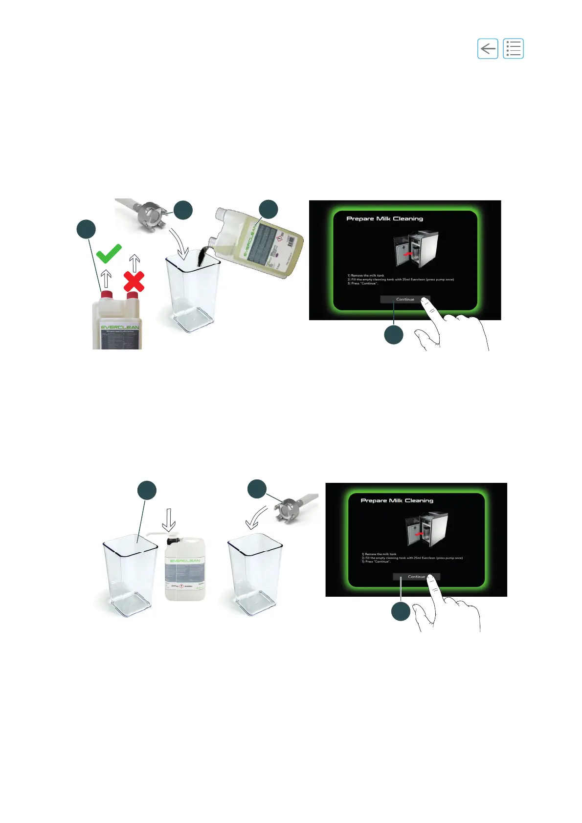 M. Place the milk tube inside the cleaning tank (2.2). Ensure that it correctly lays at the bottom of the tank.