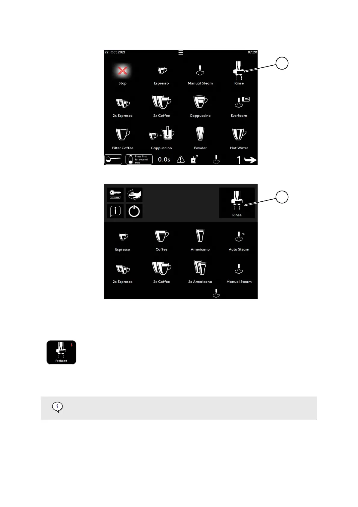 After 10 min. idle mode (no drink is being made), a pre-heat rinse is requested by the machine if this