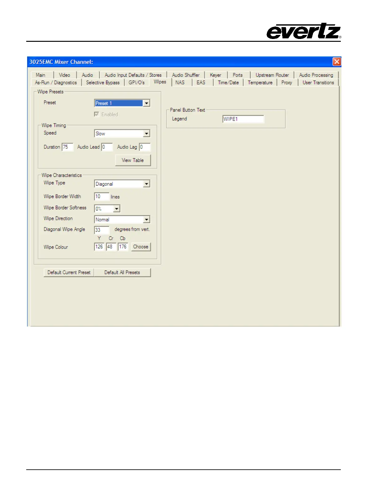 Preset: The EMC supports up to 5 pre-defined wipes. Each pre-defined preset has a legend name that