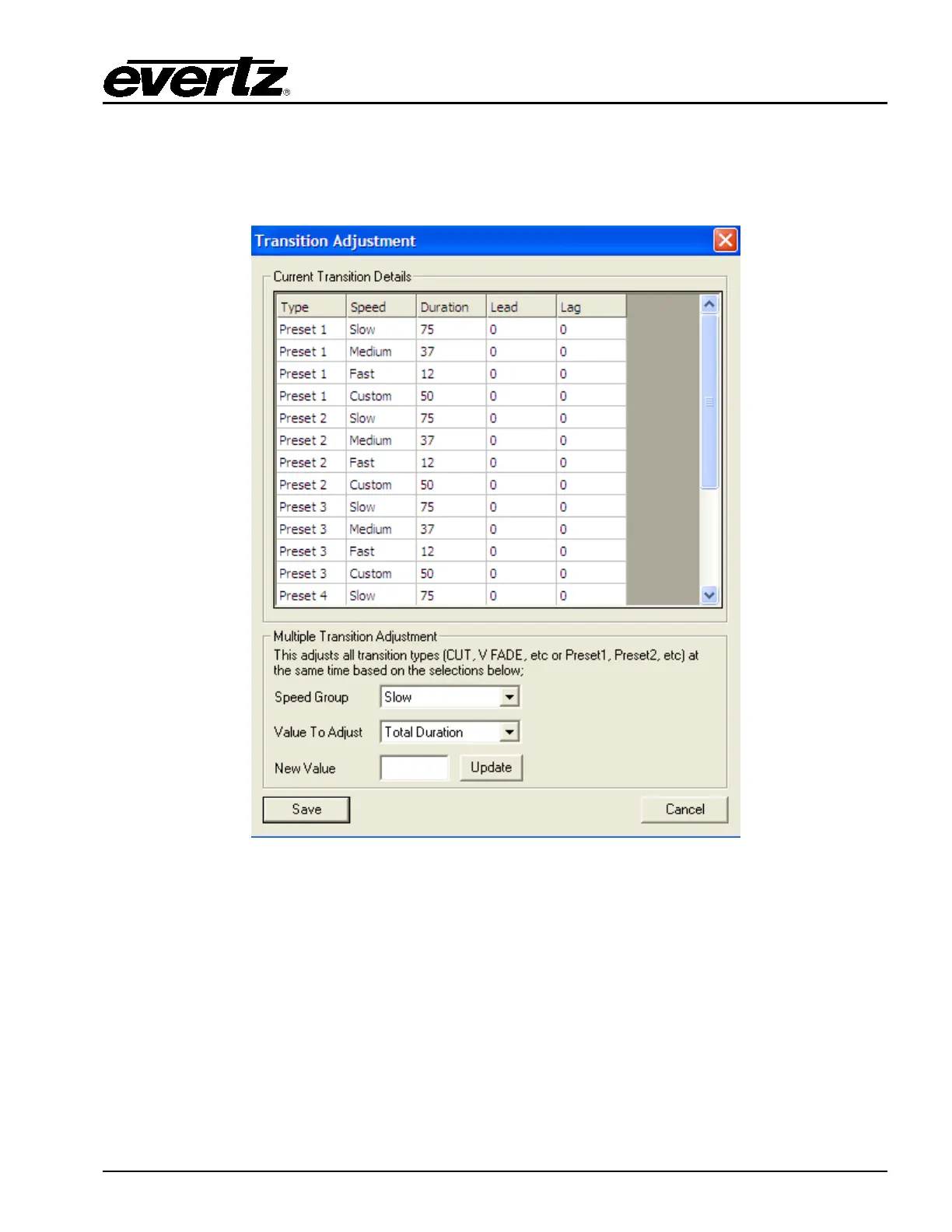 Selecting this button will open the “Transition Adjustment” window as illustrated in Figure 4-33. This