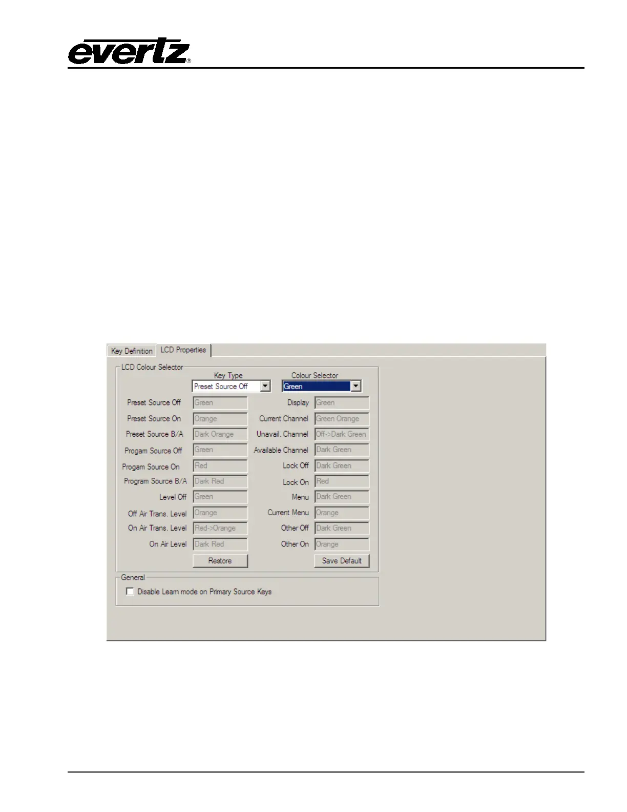The LCD Properties tab allows users to configure the colour for various behaviors of the LCD buttons.