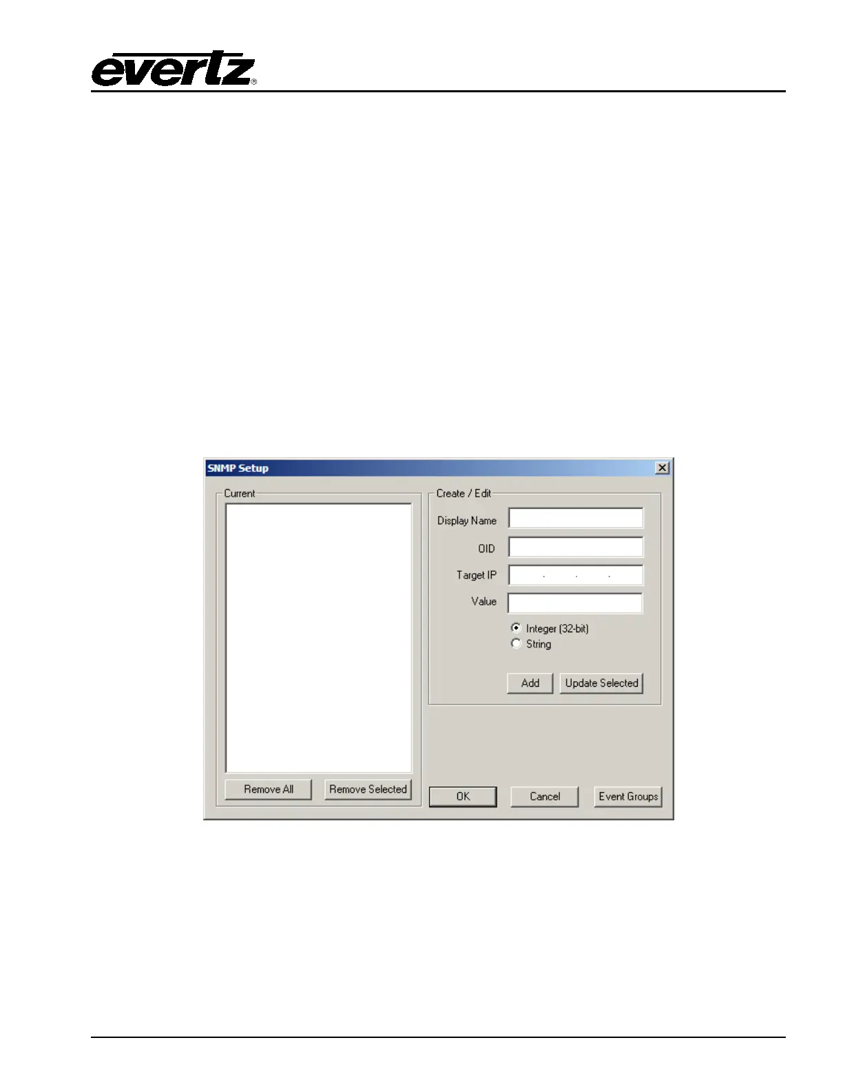The SNMP Setup window will show the list of currently created SNMP Events. The user can create or