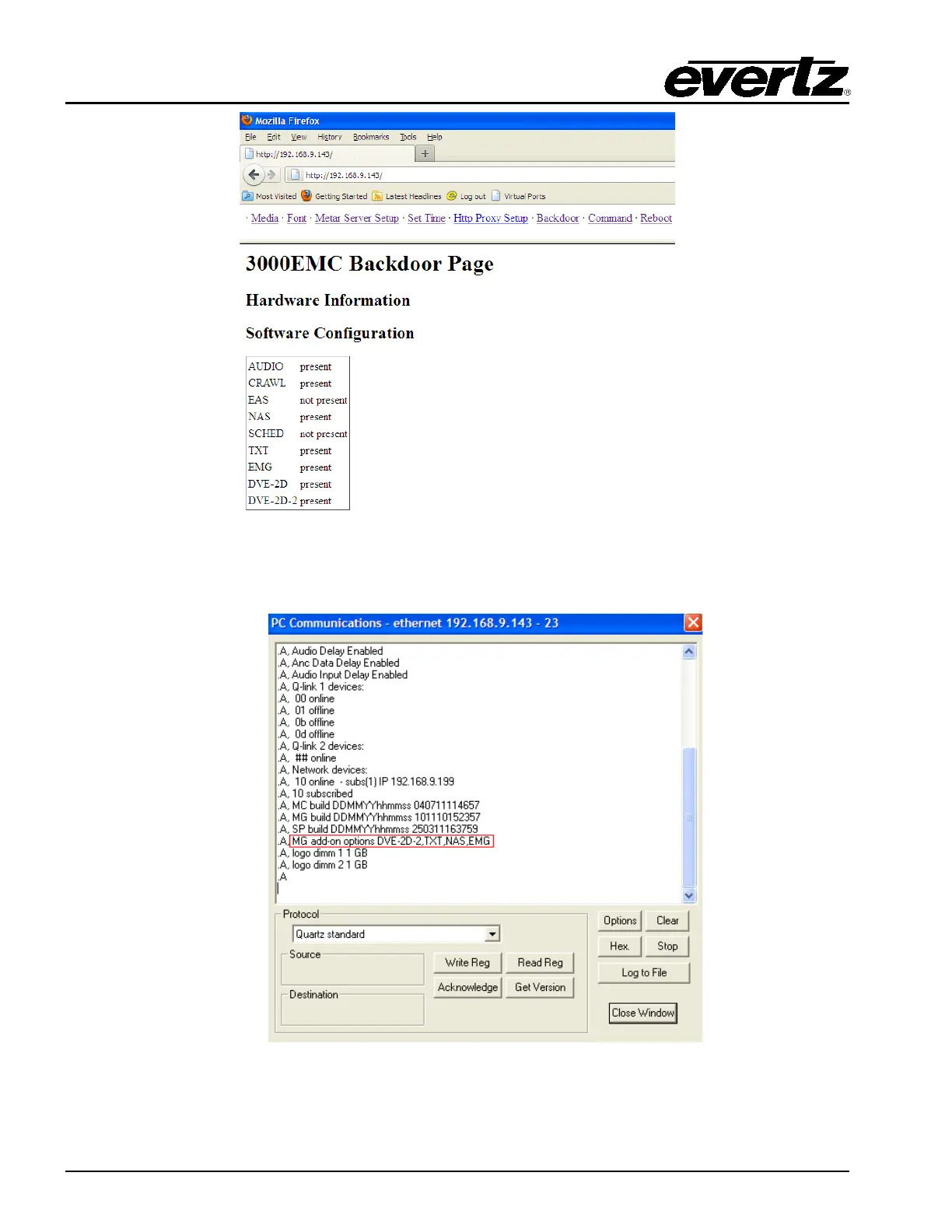 evertz 3025EMC - Figure 9-5: 3025 EMC Webpage Backdoor Tab; Figure 9-6: 3025 EMC Comms Window (Options)