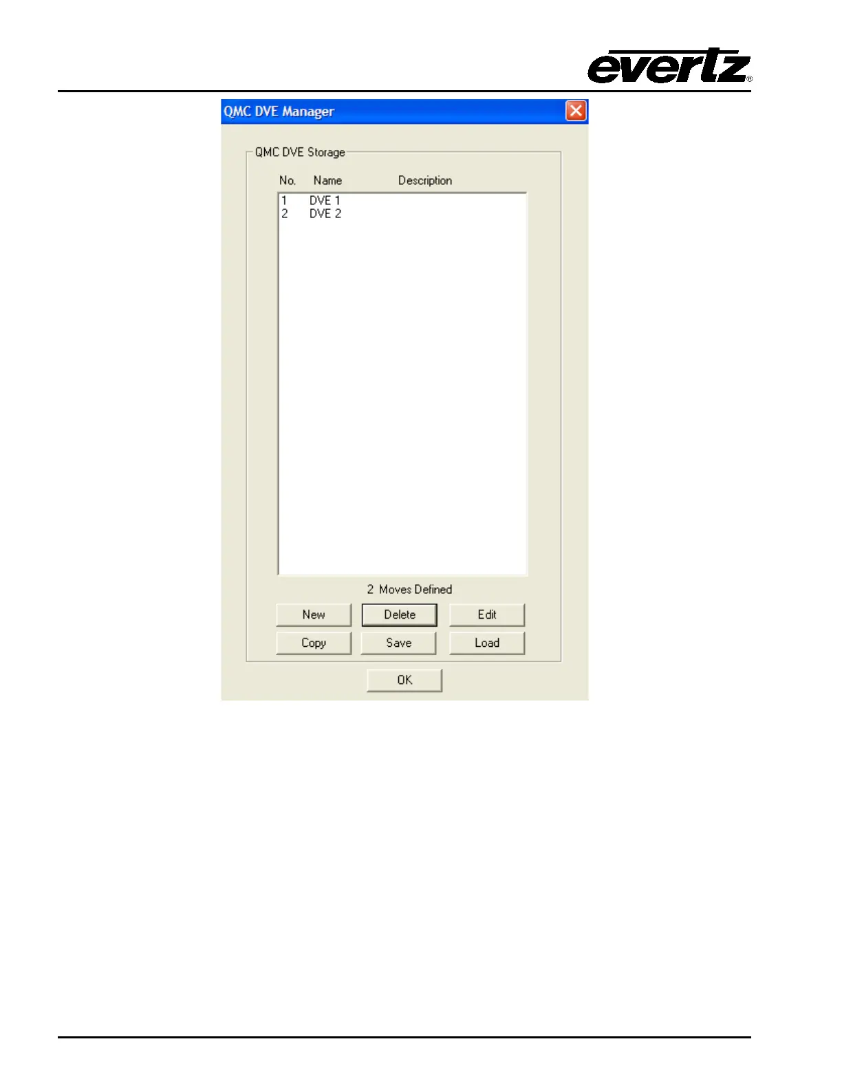 Load: Load the DVE moves from an external file located on the PC that have a .dve extension.