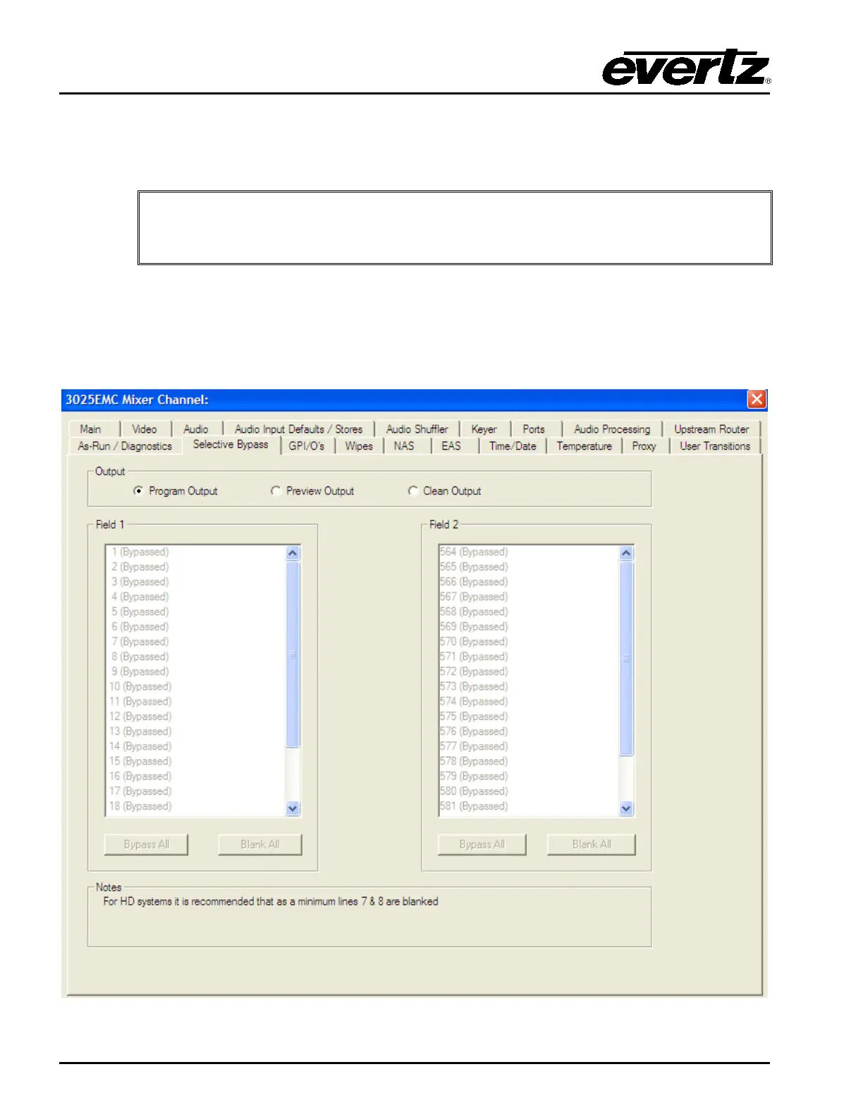 setting for Vertical Blanking Selective Bypass is lines 6 & 7 (SD) or lines 7 & 8 (HD) to be blanked. For