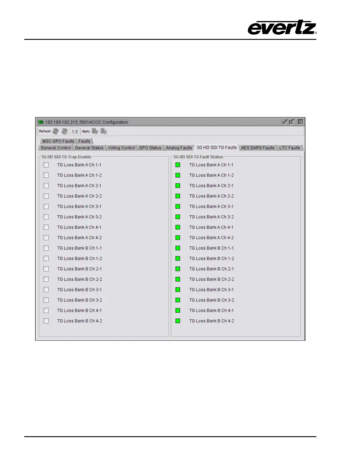 The 3G HD SDI TG Fault Status section displays whether a fault is active or not. If the box is green,