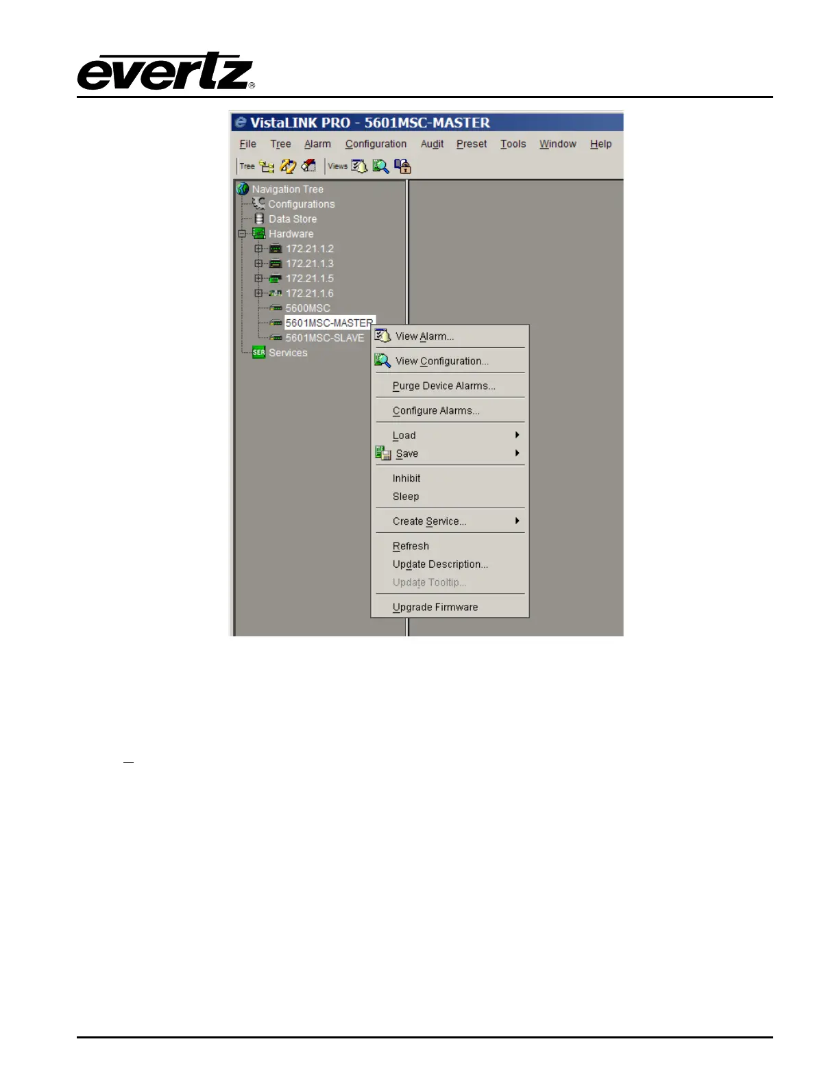 The Alarm view can be accessed by right-clicking on the 5601MSC in the Navigation Tree and selecting