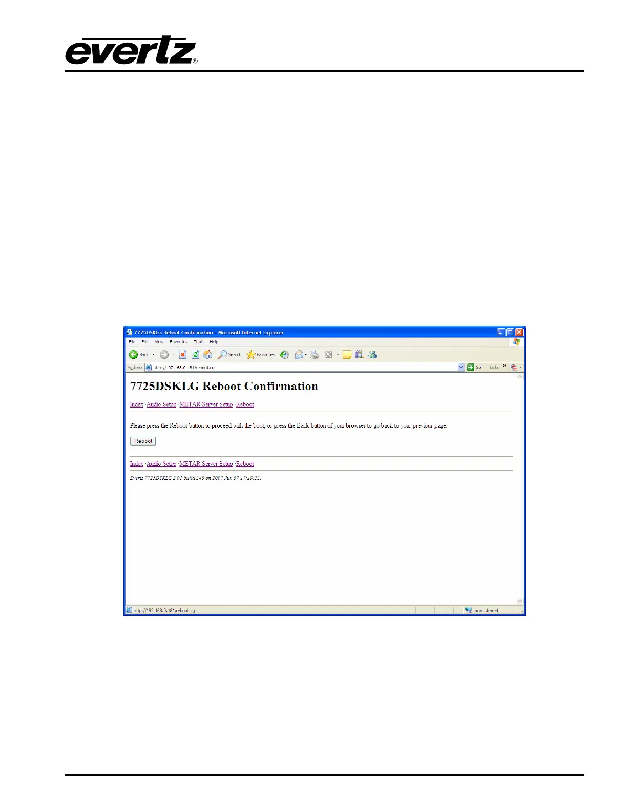 The reboot page allows the user to reboot the 7725DSK-LG remotely. After the Reboot button is