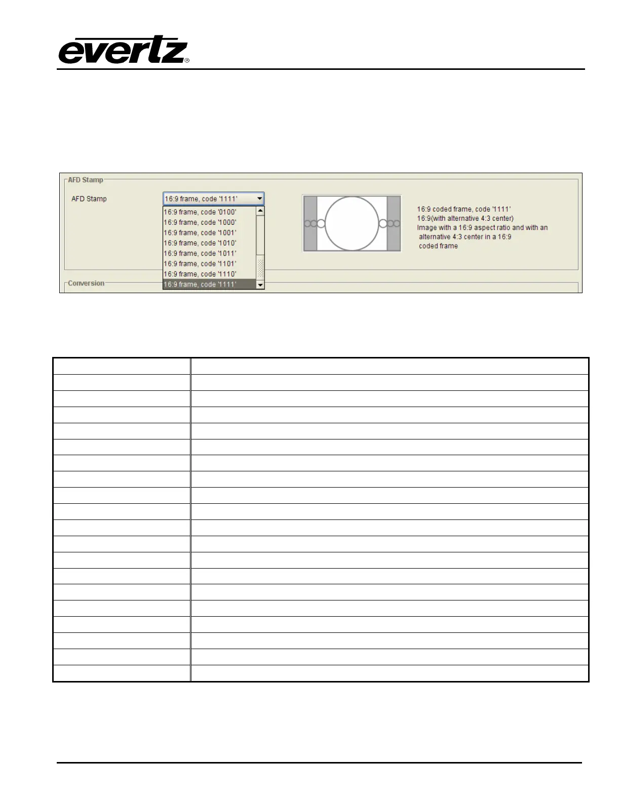 AFD code 16:9 frame, code ‘1011’ will be inserted into the outgoing video.