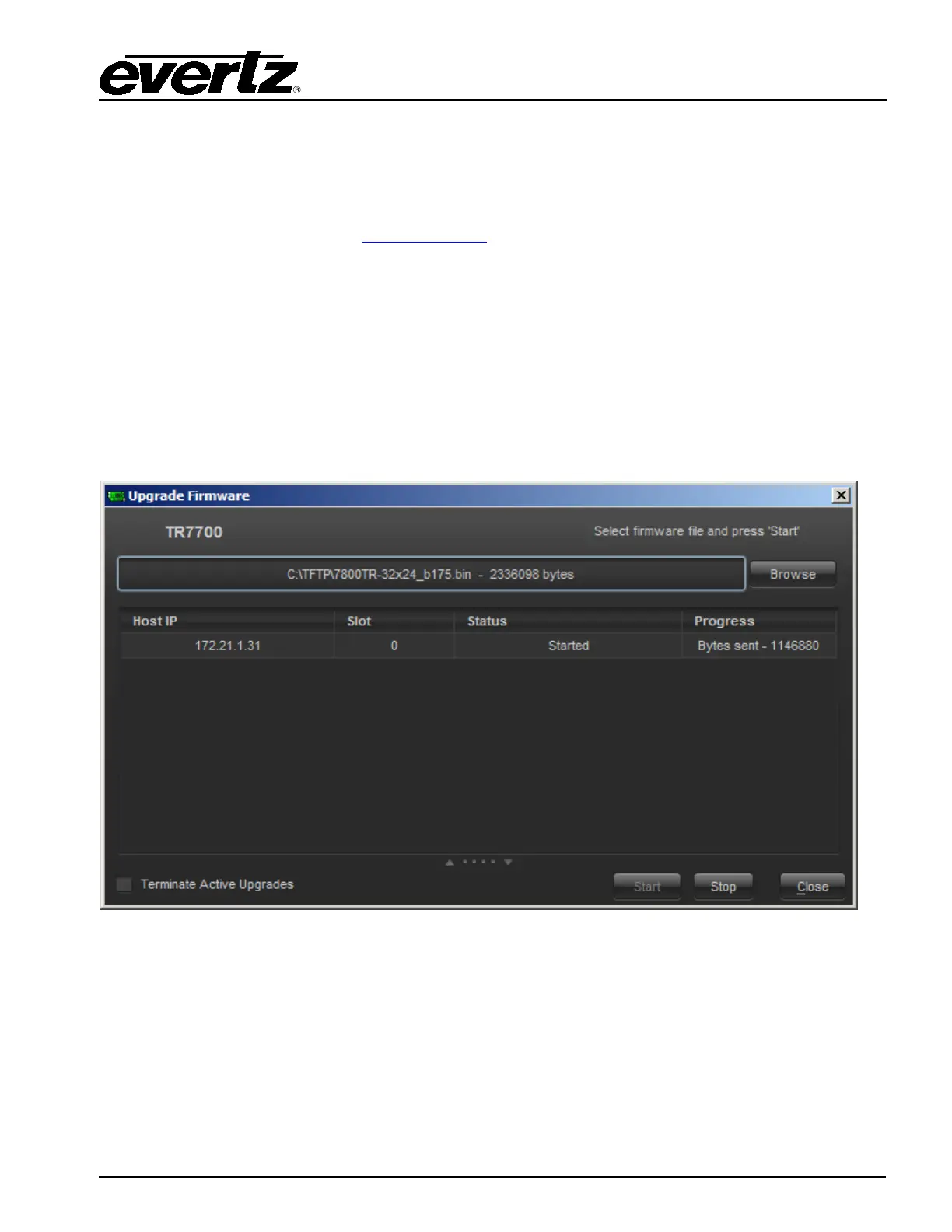 Click the Browse button and select the new firmware BIN file that was downloaded from the Evertz