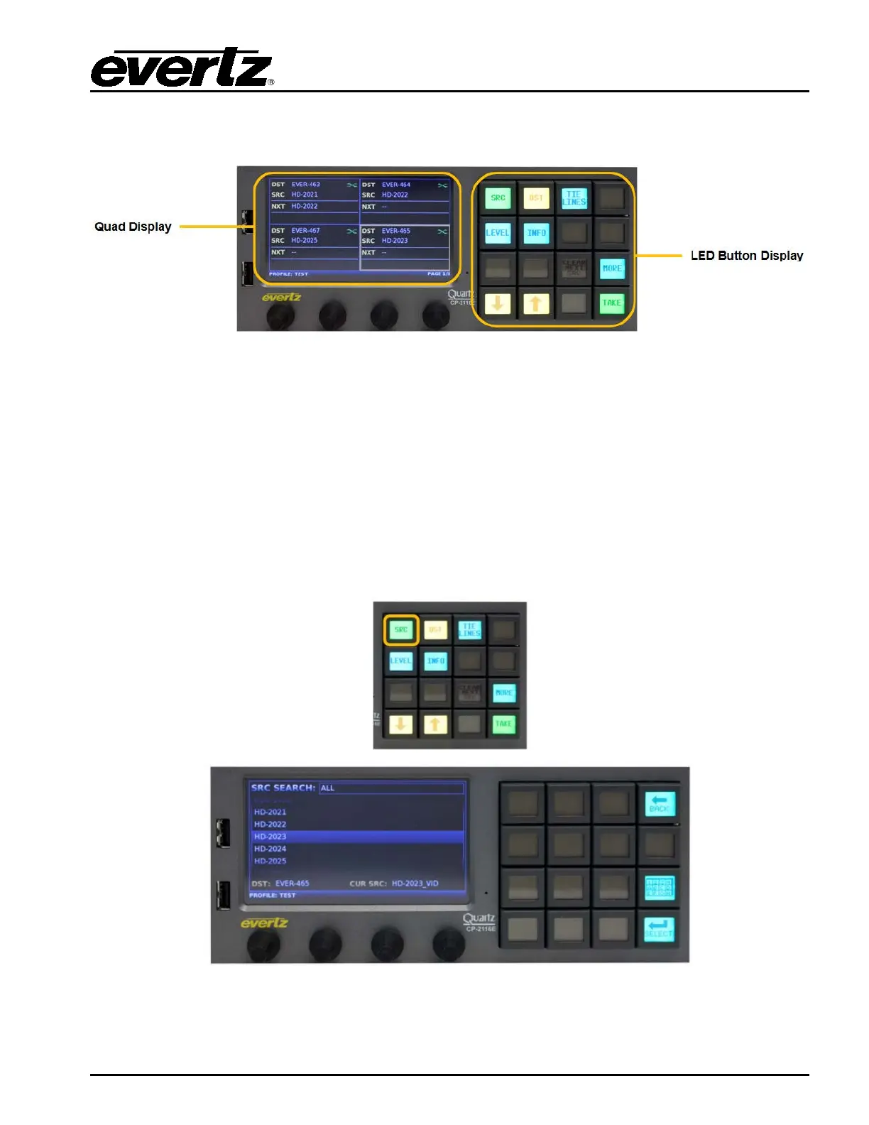 button navigation pad will contain Src, Dst, Up, Dwn, Clear Next Src, Level, More, and Take buttons.