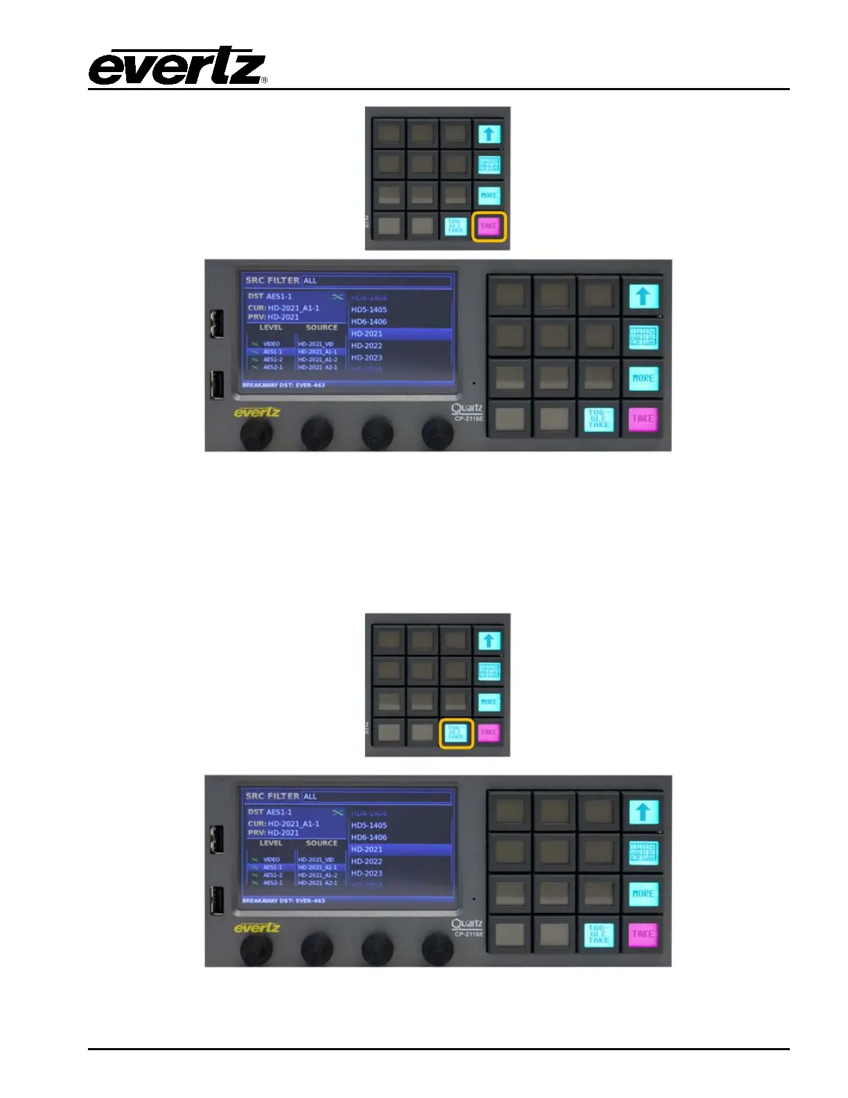 The TAKE button whether in Quad Destination View or One Destination View when pressed will