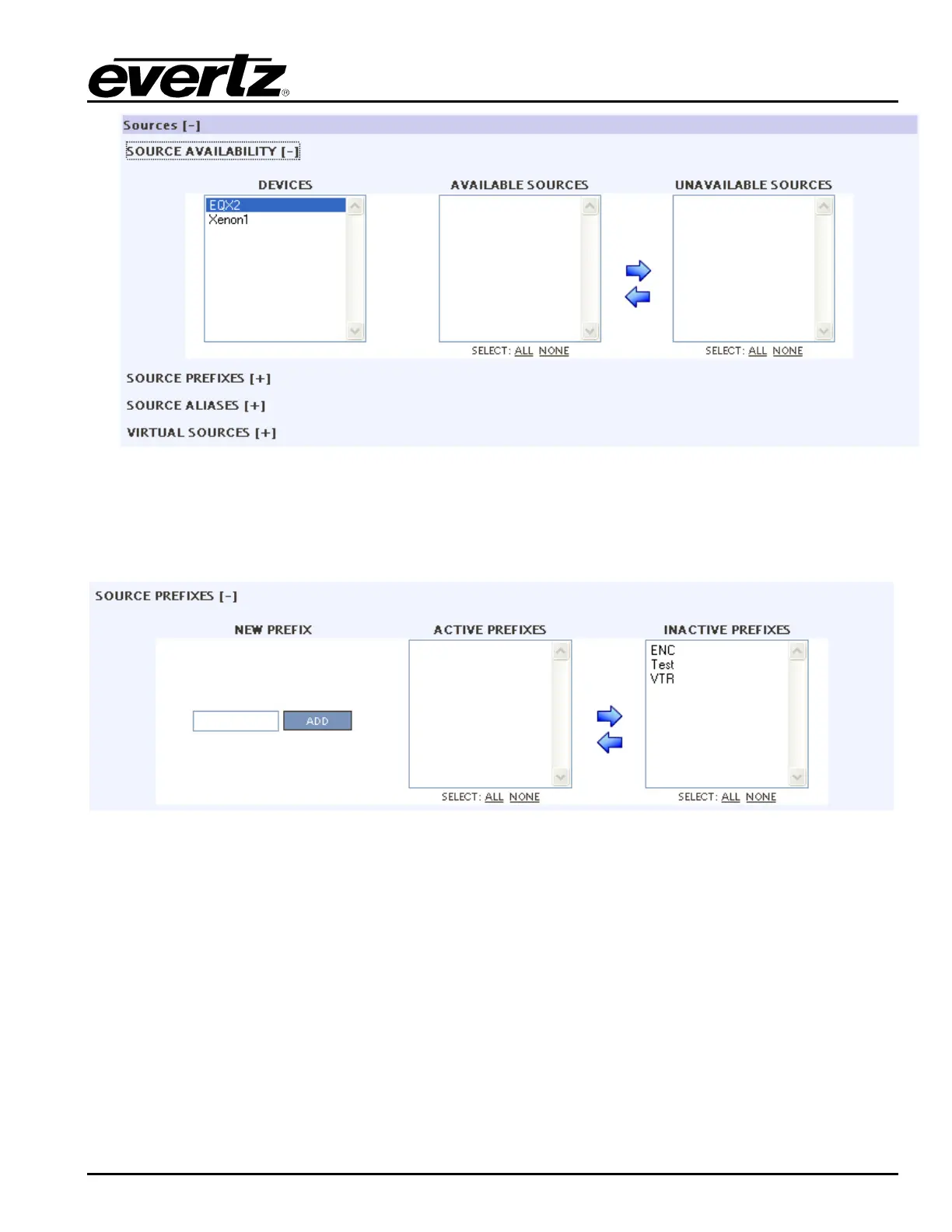 evertz EQX - Figure 4-24: Profile - Source Availability; Figure 4-25: Profile - Source Prefixes