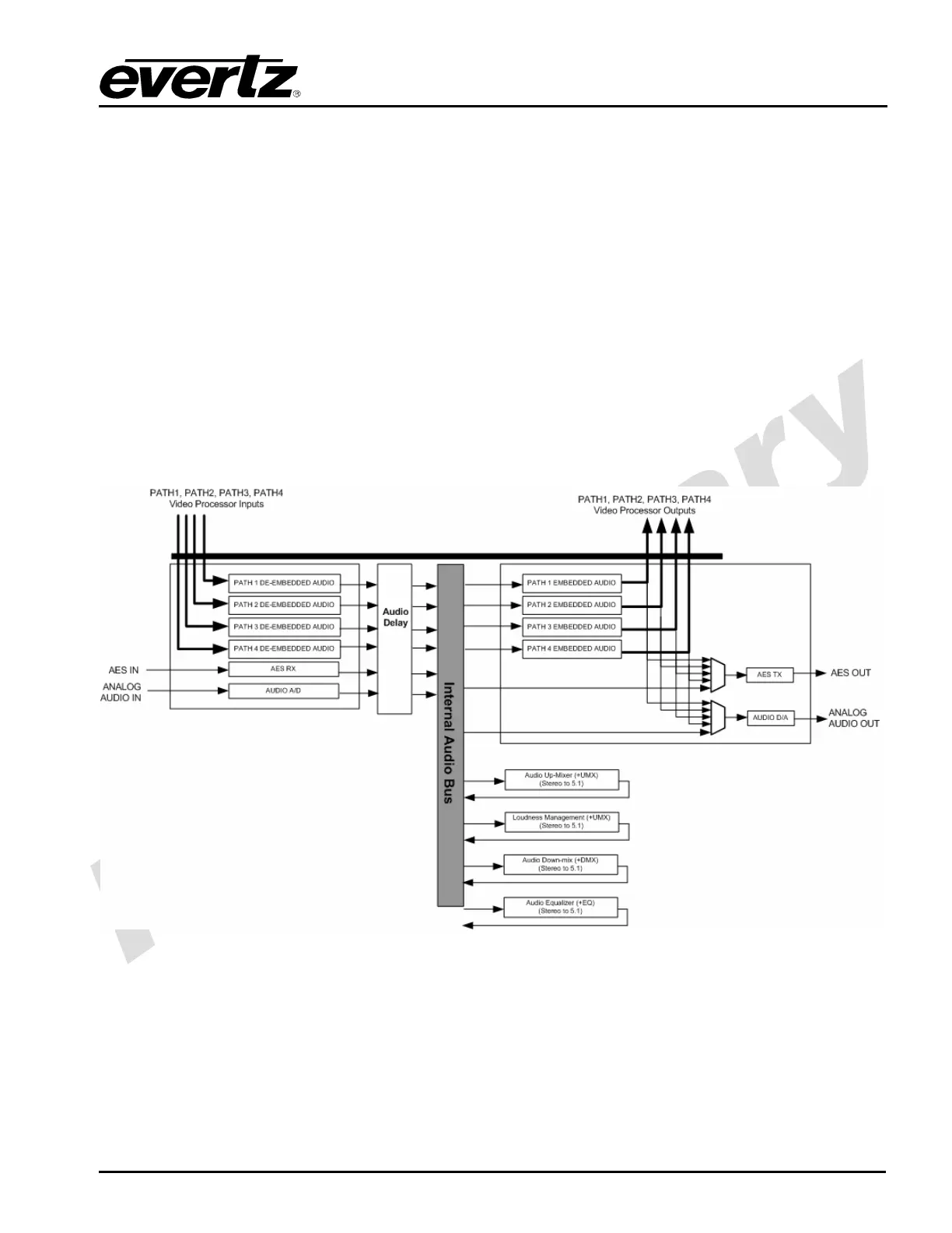 Embedded audio from the audio processor is fed back up to the output of each video processing path.