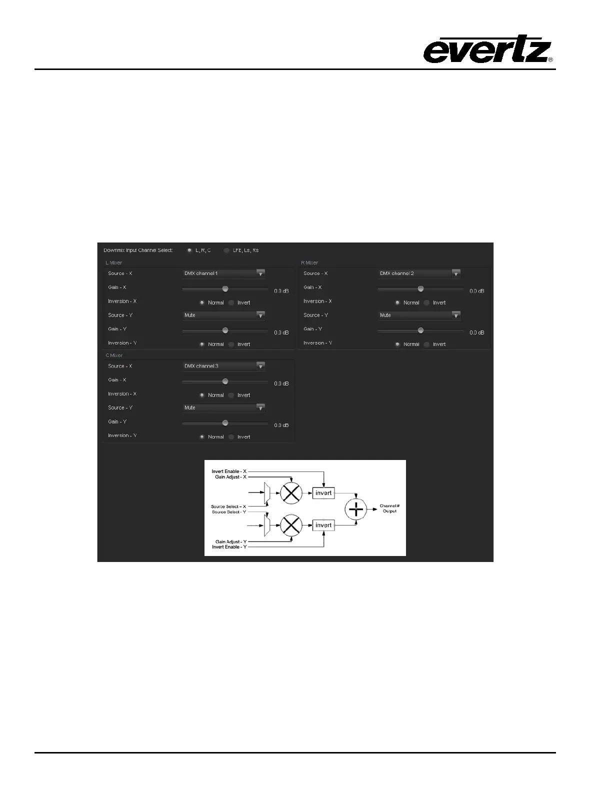 For the sake of brevity, only the Downmix Channel Mixers L, R, C control tab will be discussed in this