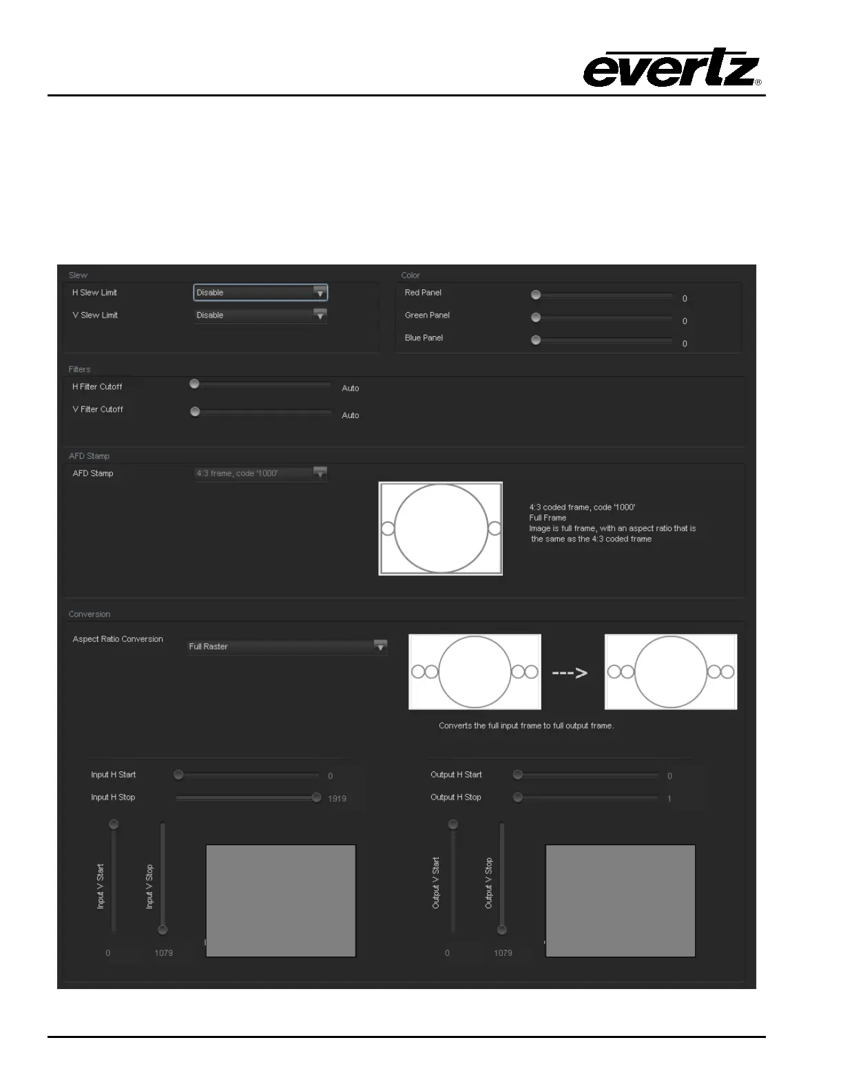 is minimized. Static side panel colours and output AFD stamping values are also adjusted within this tab.