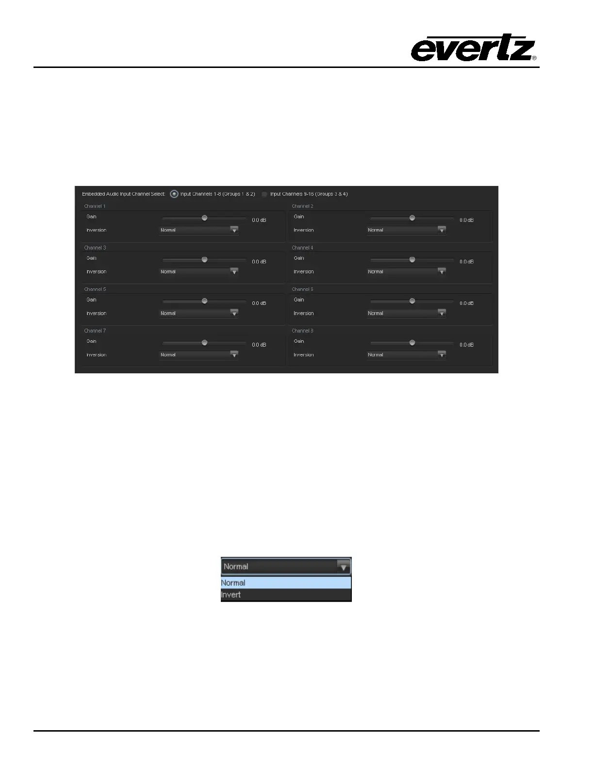 associated with the AES audio inputs. Audio input Correction is used to adjust the Gain, Inversion of the