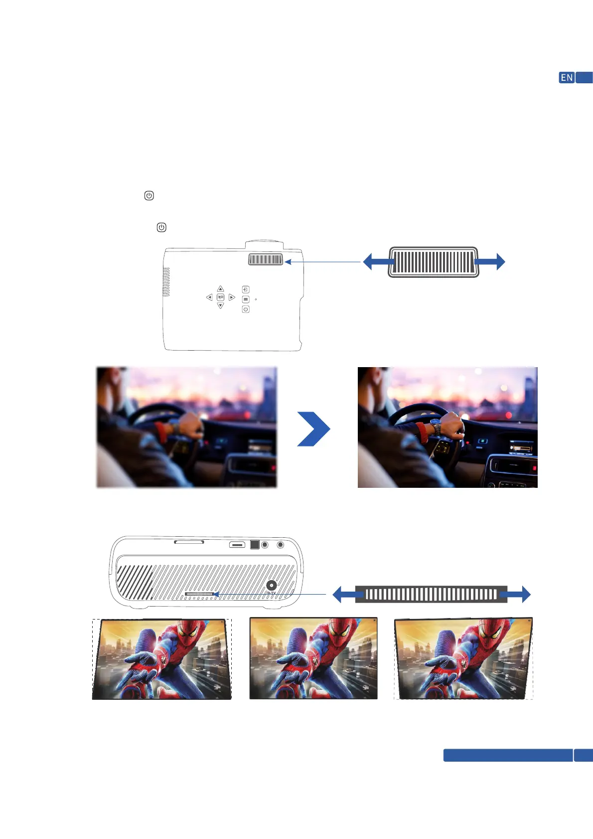 wheel (located at front) and keystone correction ring (located at rear) simultaneously until to get crystal clear images