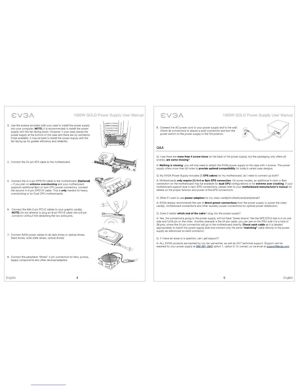 EVGA 1000G - Frequently Asked Questions; Customer Support Contact; Dual EPS Cable Configuration; Power Adapter Usage Advice