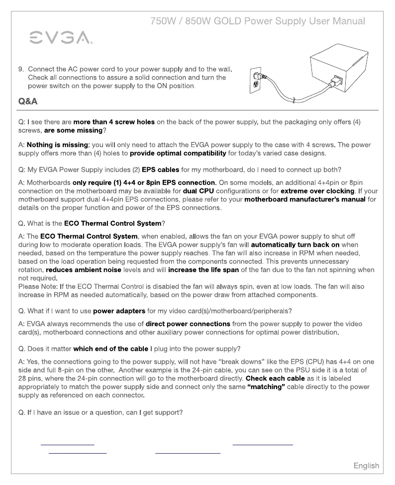 EVGA SuperNOVA 750G2 - Installation; Step 9: Connect AC Power Cord; Frequently Asked Questions (Q&A); ECO Thermal Control System Explained