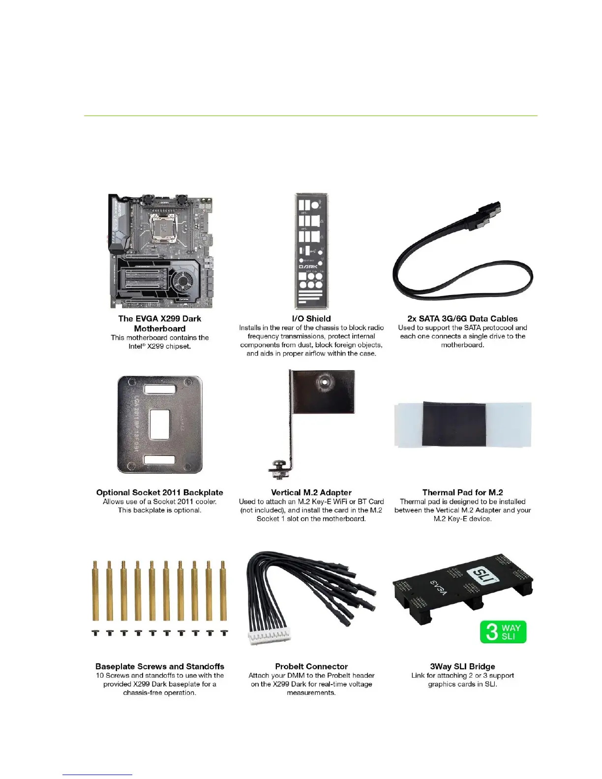 The following accessories are included with the EVGA X299 DARK