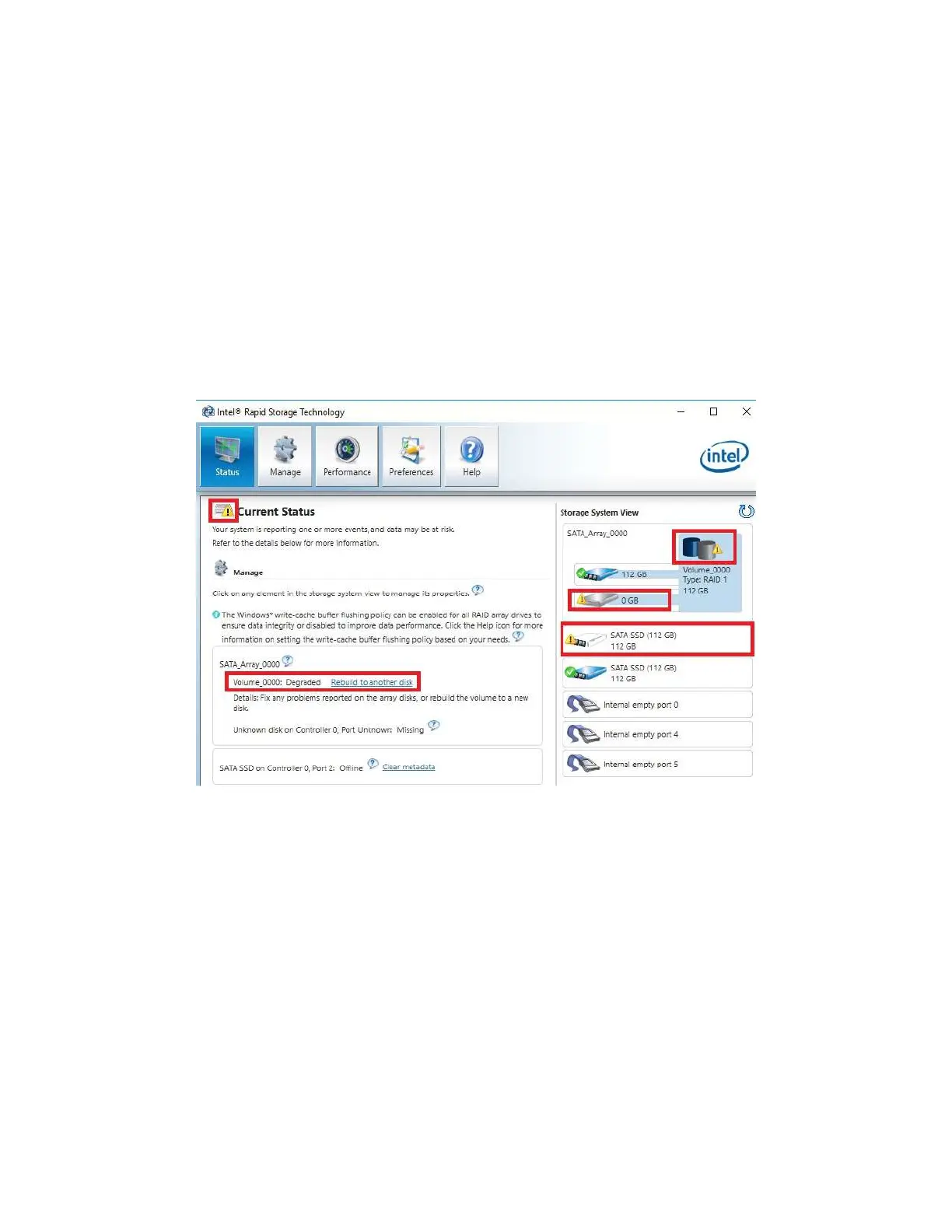 missing/failed drive. The IRST also shows several warnings, the "!" for "Status," a"!" for