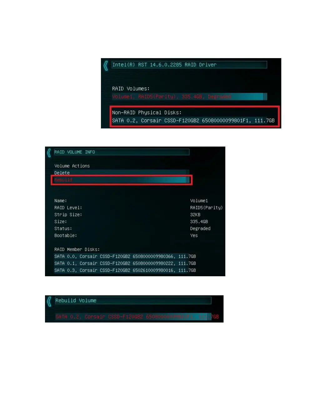 Select the degraded RAID volume, then select “Rebuild” on the following menu.