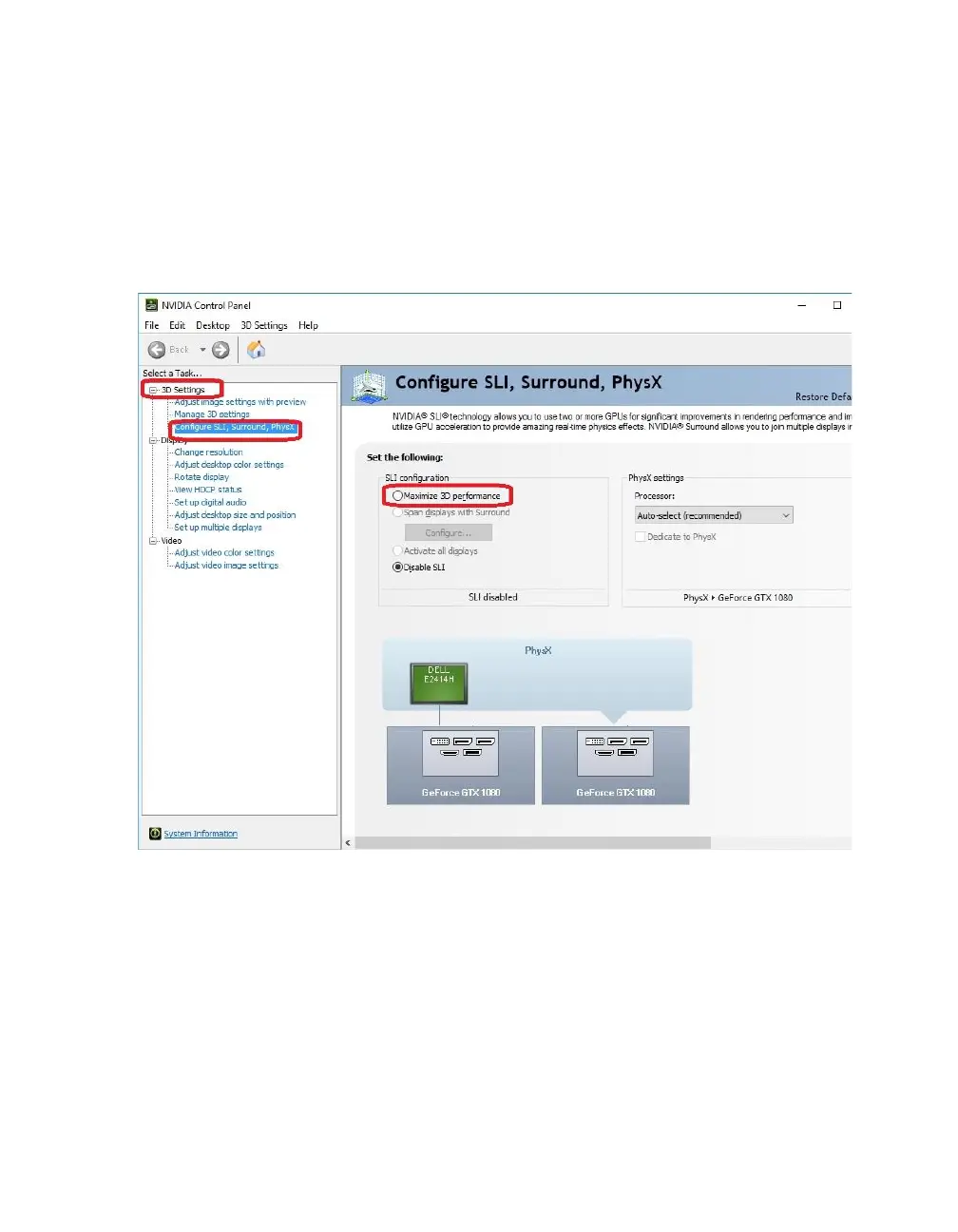 To enable SLI, click “Maximize 3D Performance,” circled in red below, and click