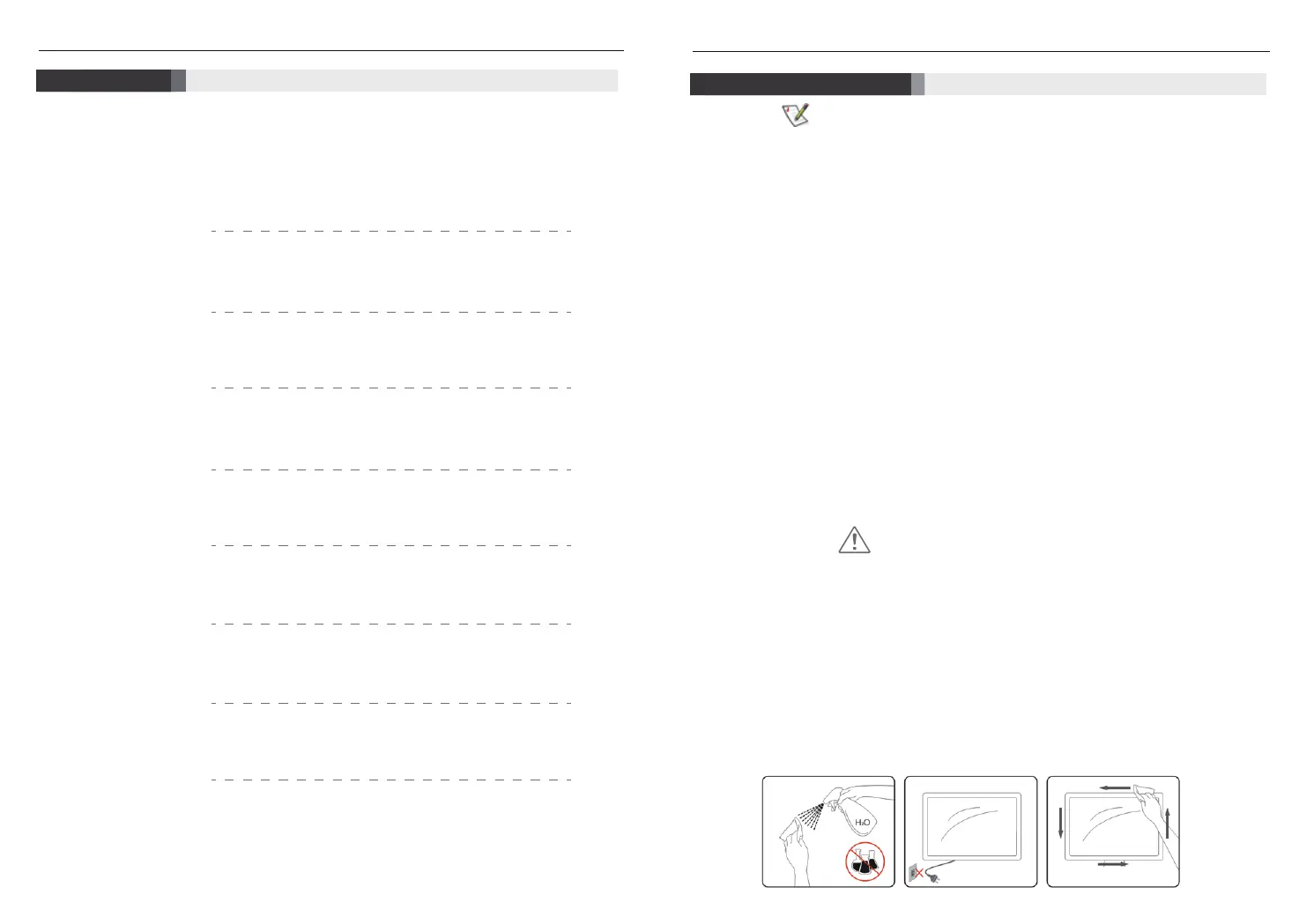 • Please do not use liquid with Alcohol or Acetone, but use special detergent for cleaning screen. And to prevent