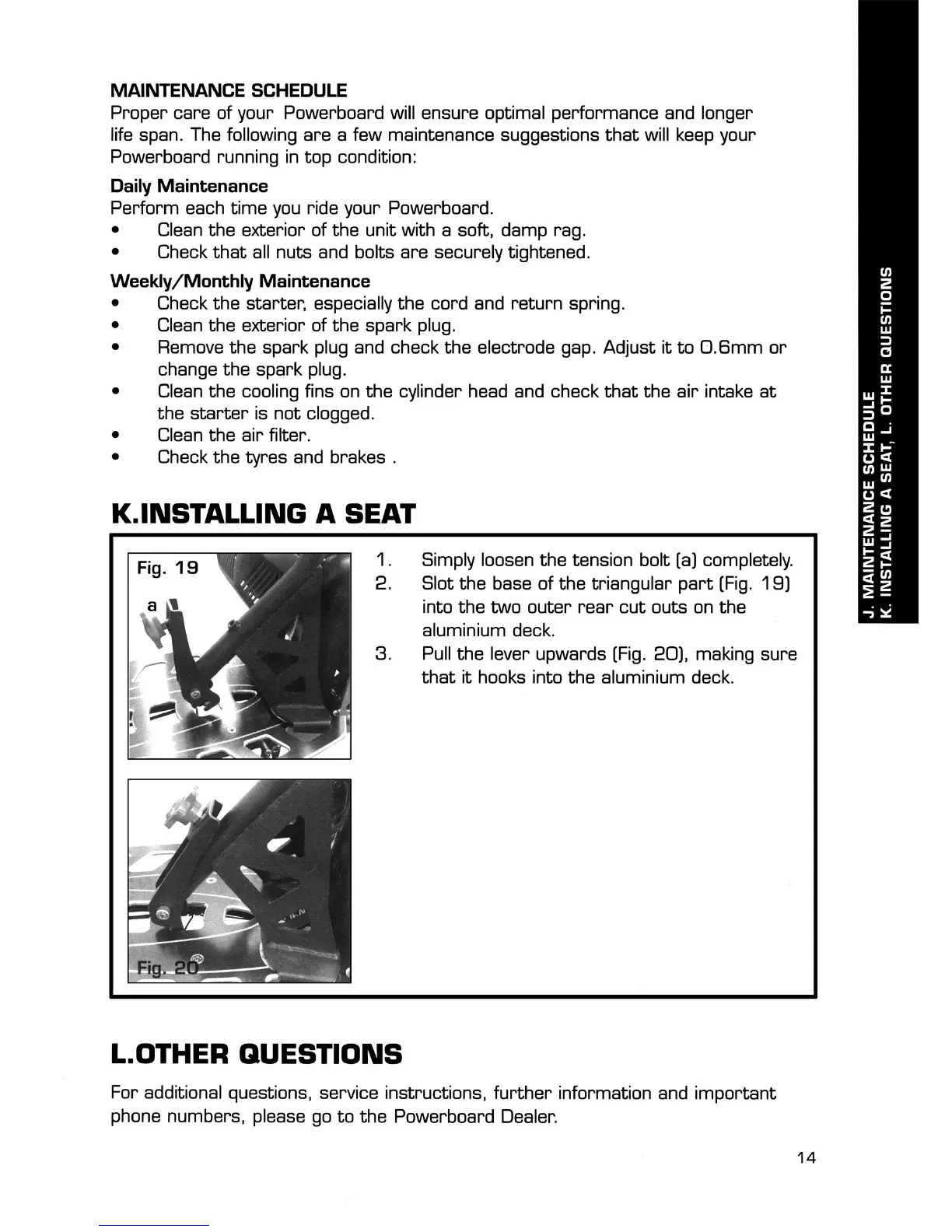 Evo 2x Big 50cc - Installing a Seat; Maintenance Schedule; Daily Maintenance; Weekly;Monthly Maintenance