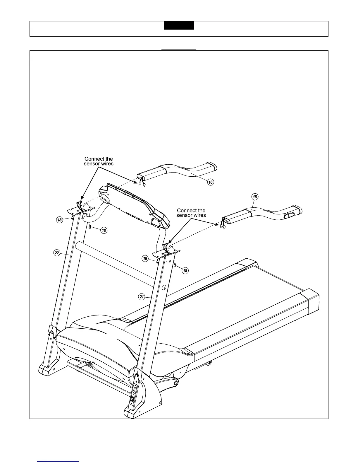 Connect the Sensor Wires then attach the Right and Left Handlebars (16 and 15) to the Right and Left Handle Uprights (22