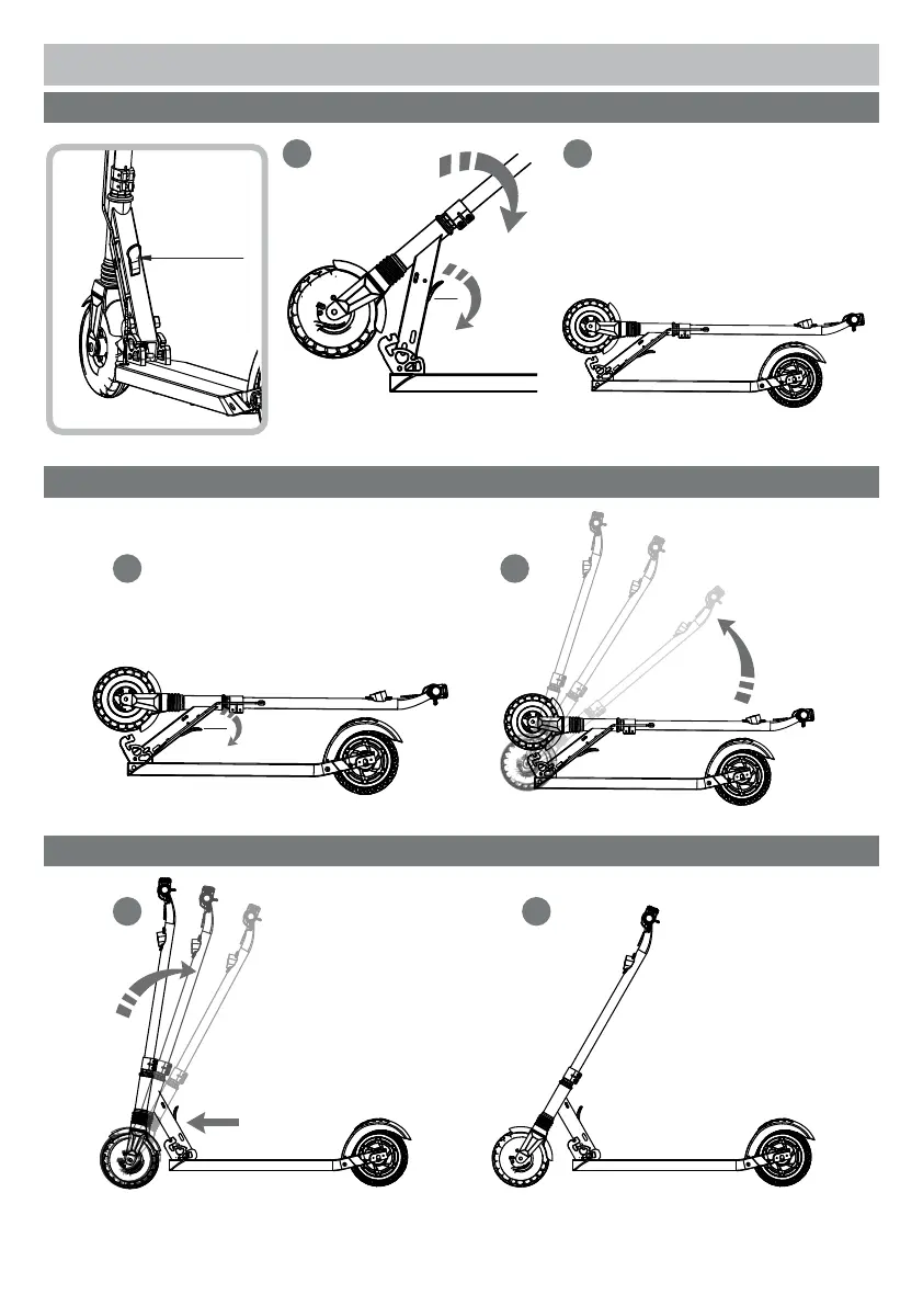 ● Lift down the folding lever. Push down the steering column slowly until the deck reaches the ground.