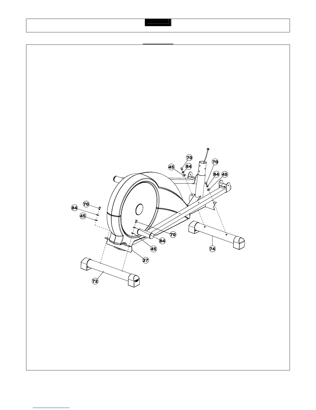 Attach the Front and Rear Stabilizers (74 and 72) to the Main Frame (27) using four M8 x 22mm Allen Head Bolts (70),