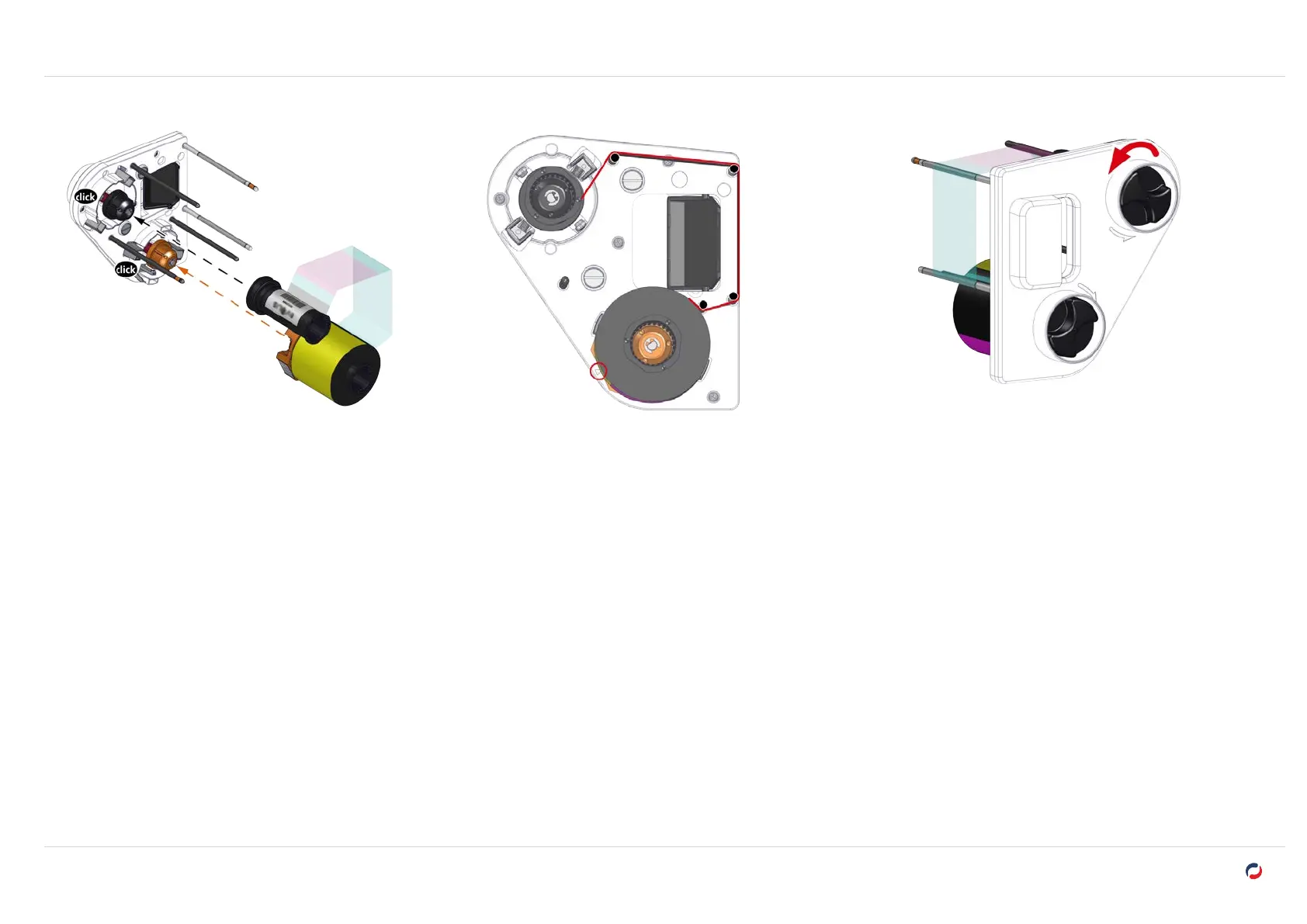 5. Insert the start (full) roll of the ribbon on the orange spindle. The ribbon unwinds upward. A