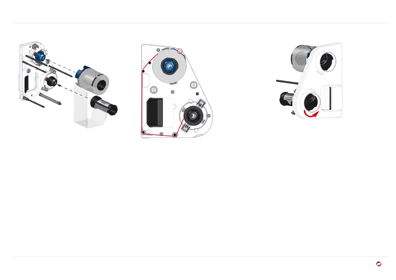 5. Insert the start (full) roll of the film on the blue spindle. The film unwinds downwards.