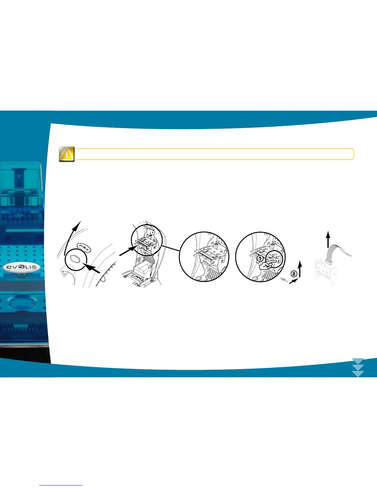Tilt the head carefully and disconnect the connector linked to the cable without using force on the mechanism.