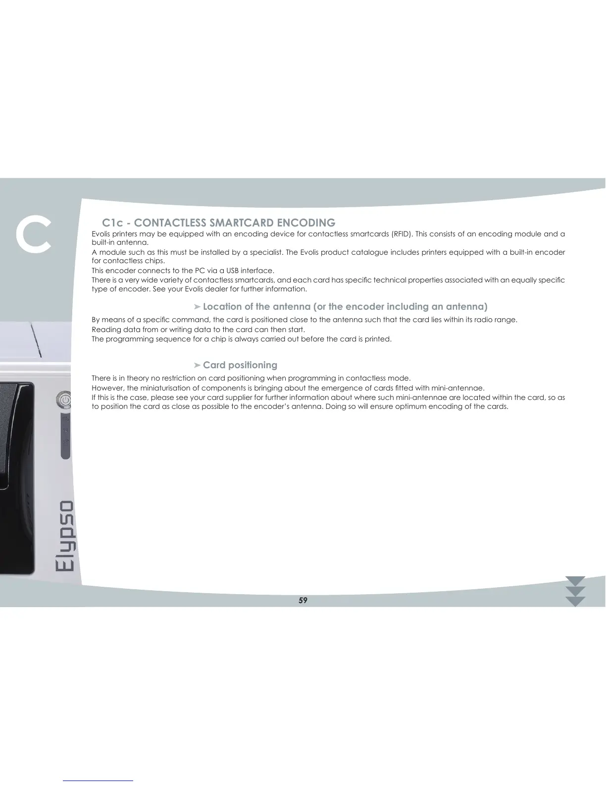 Evolis printers may be equipped with an encoding device for contactless smartcards (RFID). This consists of an encoding module and a