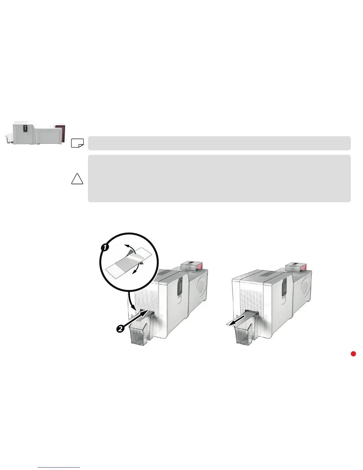 Insert the adhesive cleaning card into the opening above the output hopper on the left hand side. The card will pass inside the printer. Repeated