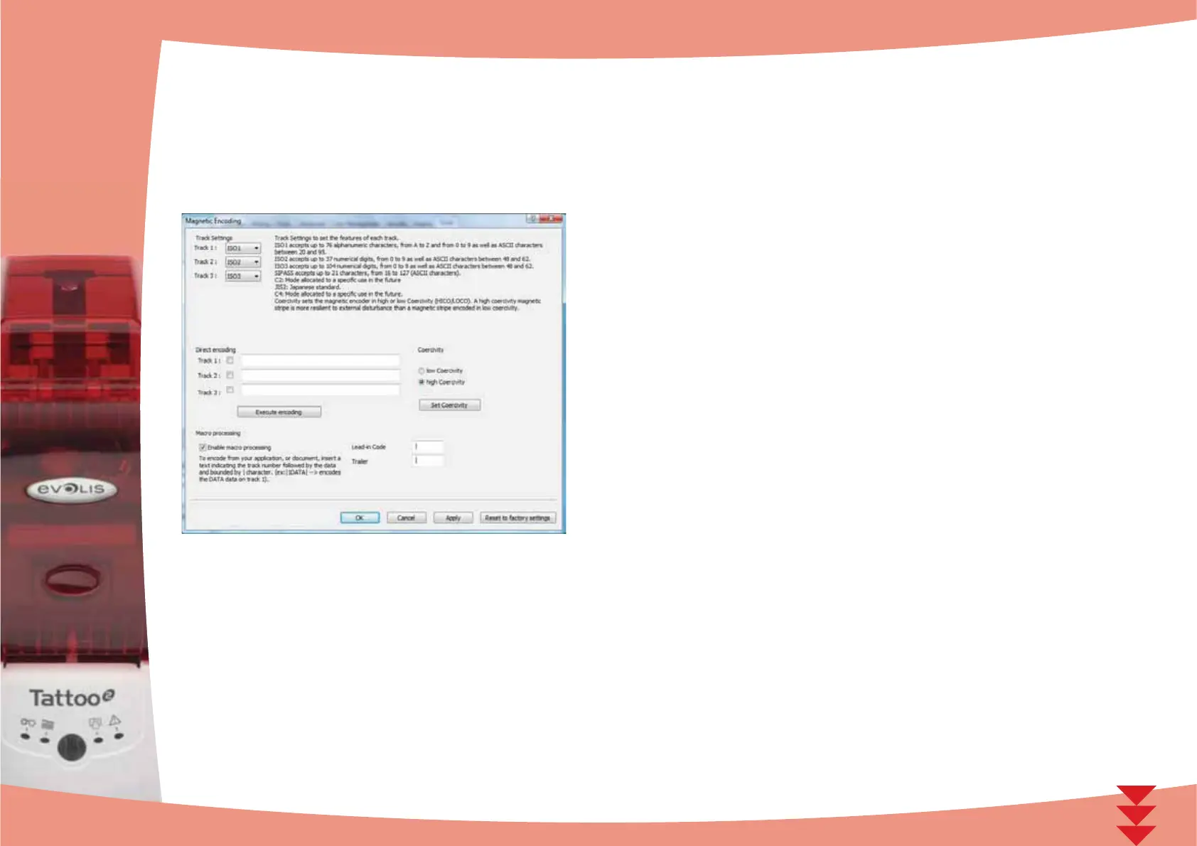Track settings is used to select the desired ISO standard for each magnetic strip.