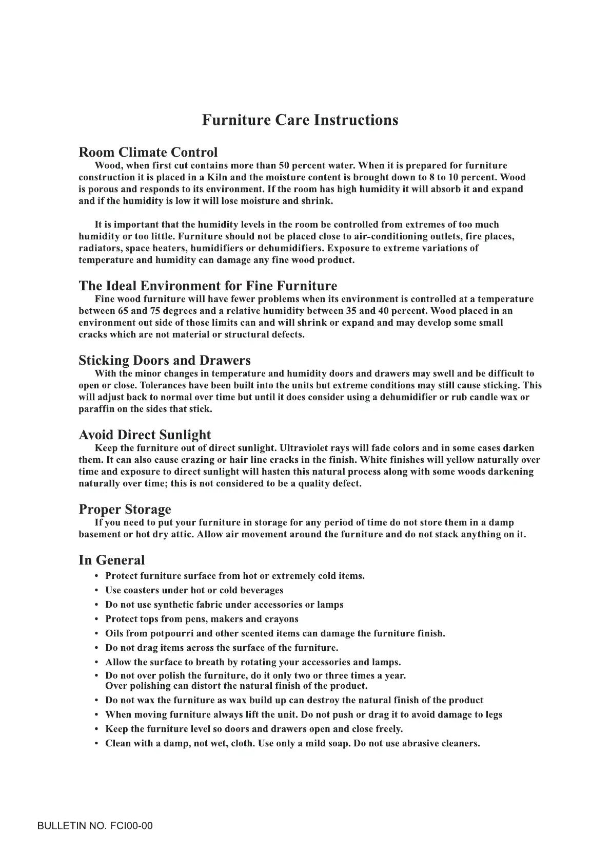 Evolur AMSTERDAM - Furniture Care Instructions; Room Climate Control; Ideal Environment for Fine Furniture; Sticking Doors and Drawers