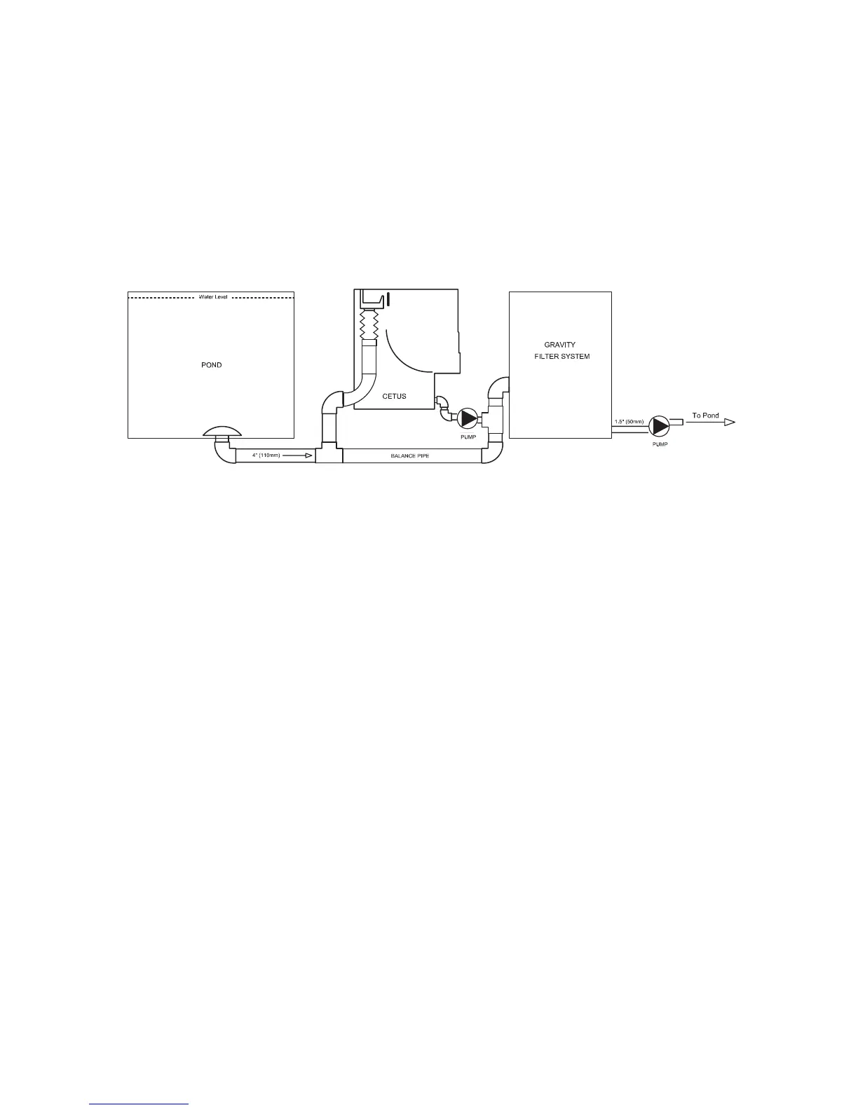 1) Water leaves the pond via a 4” bottom drain and travels to the first T-piece