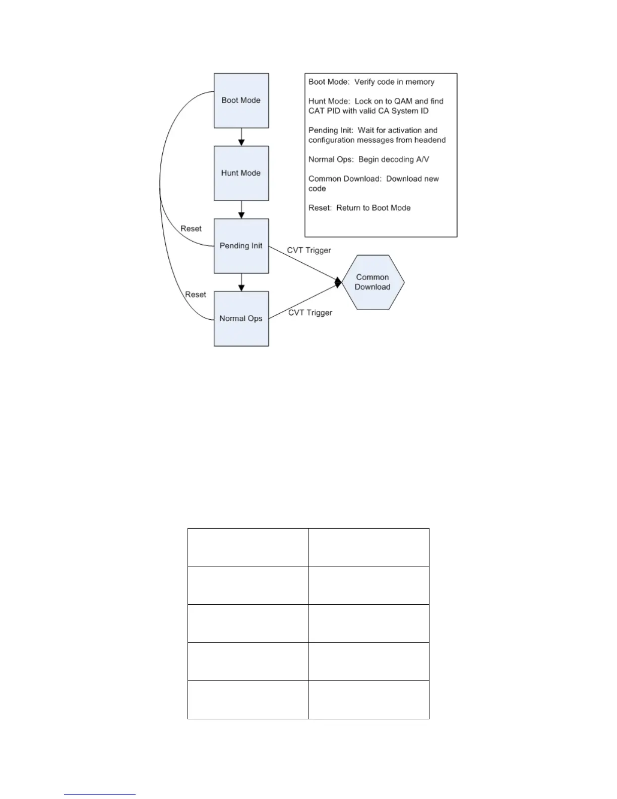 The DTA will enter Boot Mode when power is applied or after a reset command has been received from the headend