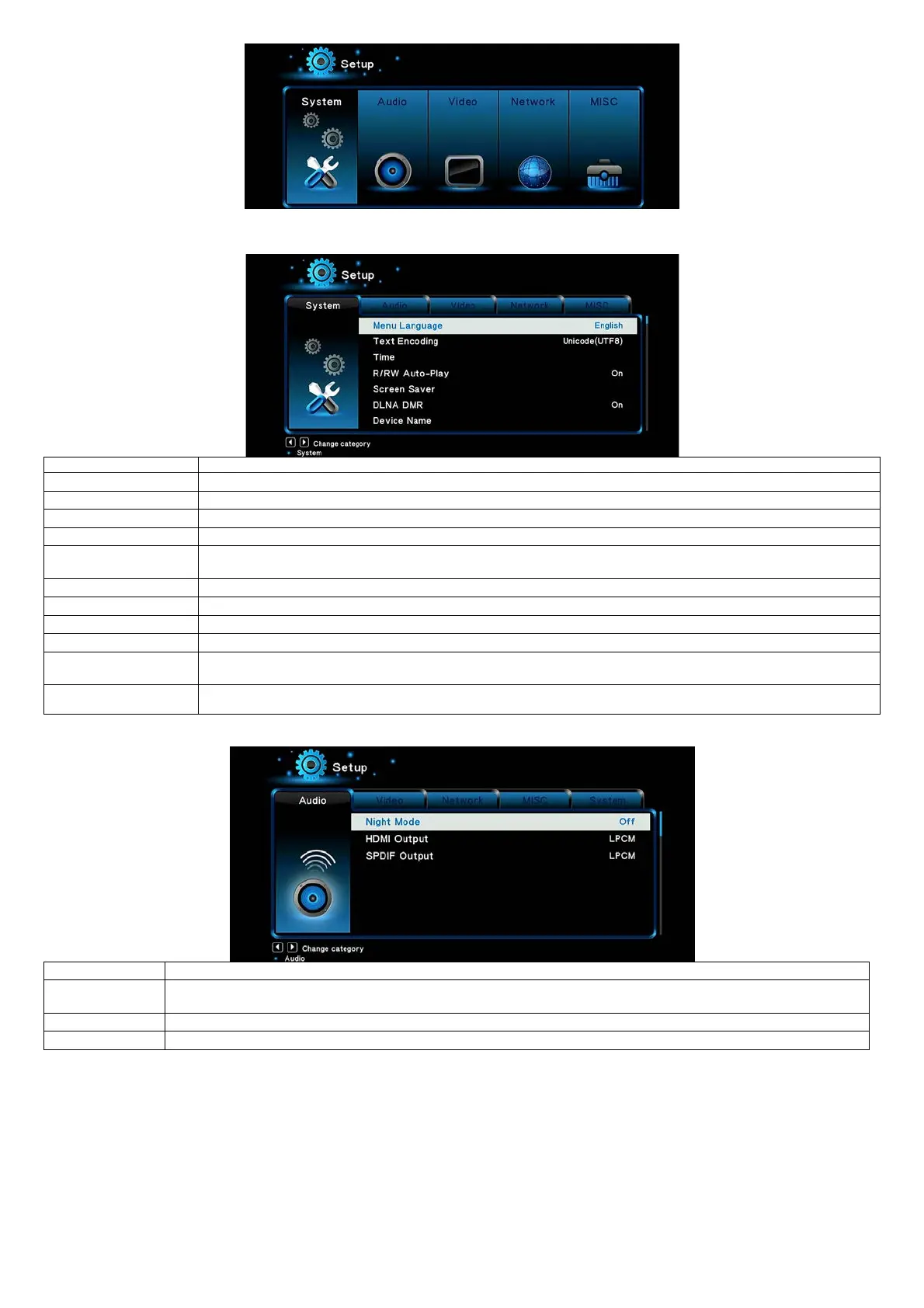 V submenu sa nachádza šesť možností nastavenia: Systém, Zvuk, Video, Sieť a Rôzne.