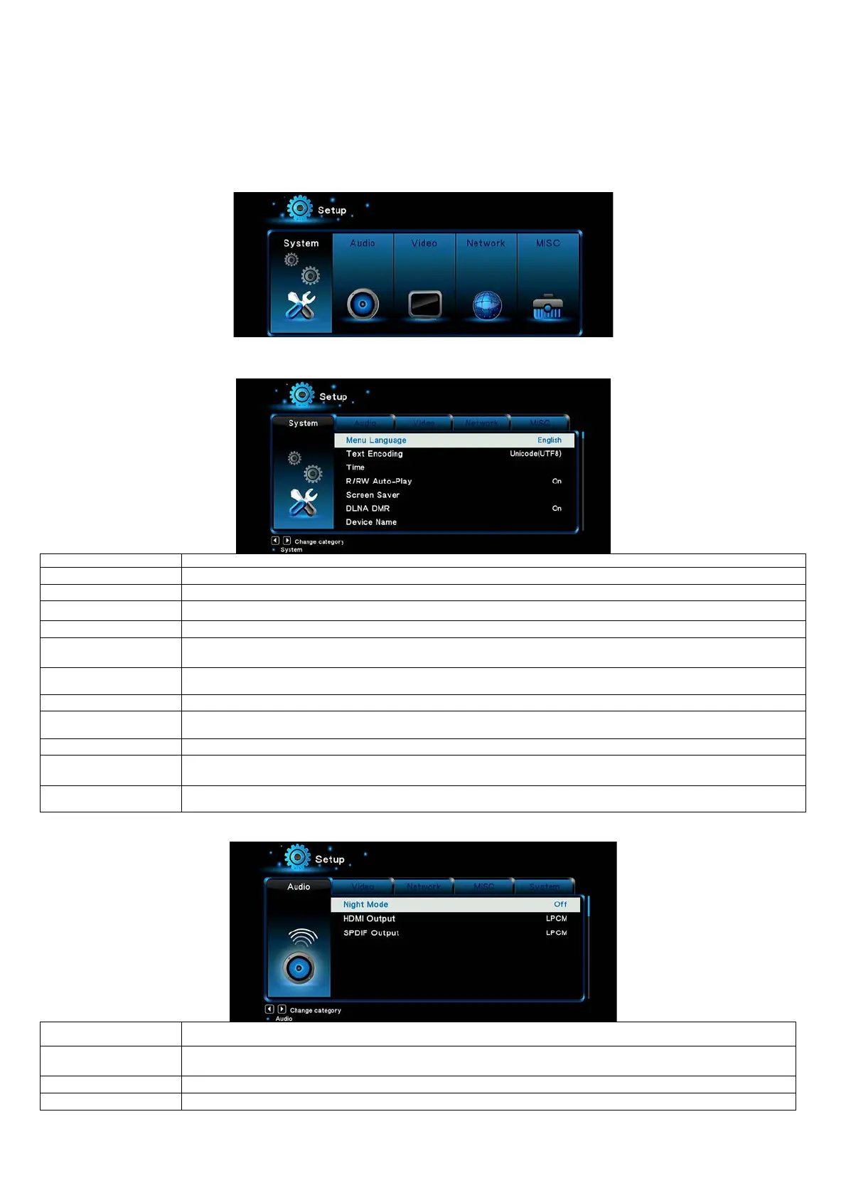 W podmenu znajduje się sześć opcji ustawienia: System, Audio, Video, Sieć i Różne.