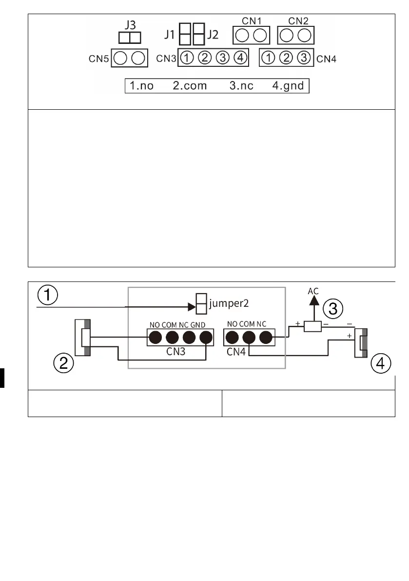 1. jumper: CN3-nak megfelelő lekapcsolás az elektronikus zár csatlakoztatásához.