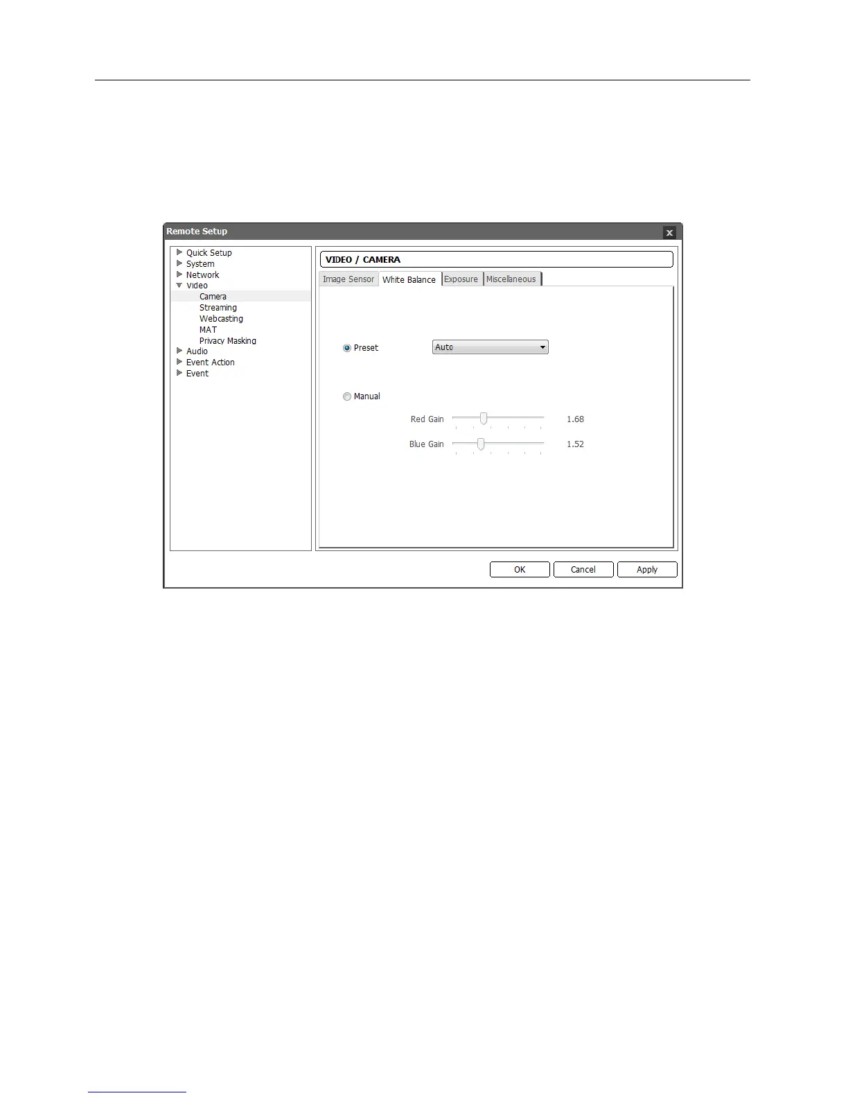 Manual: Select to adjust the white balance manually. Adjust the Red and Blue gain. The higher