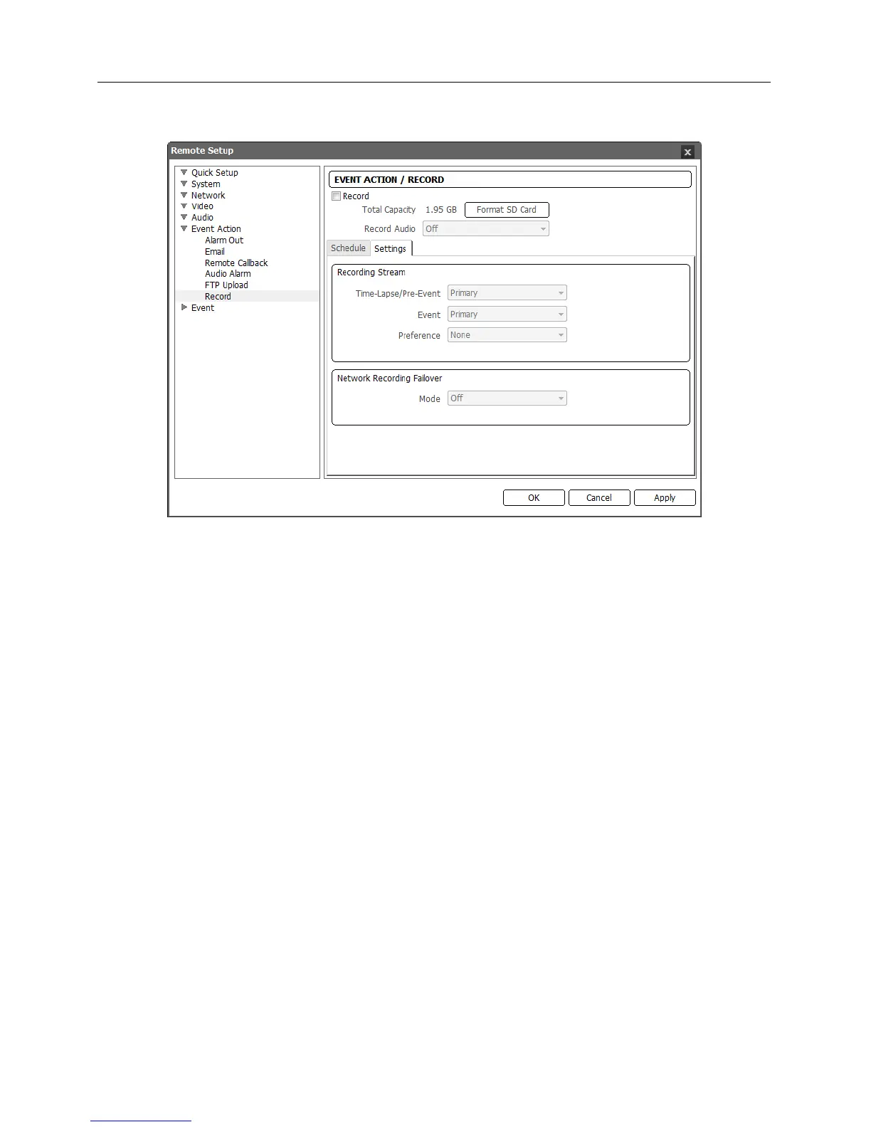 SD Recording: Records video by using the Time-Lapse/Pre-Event and Event streams set