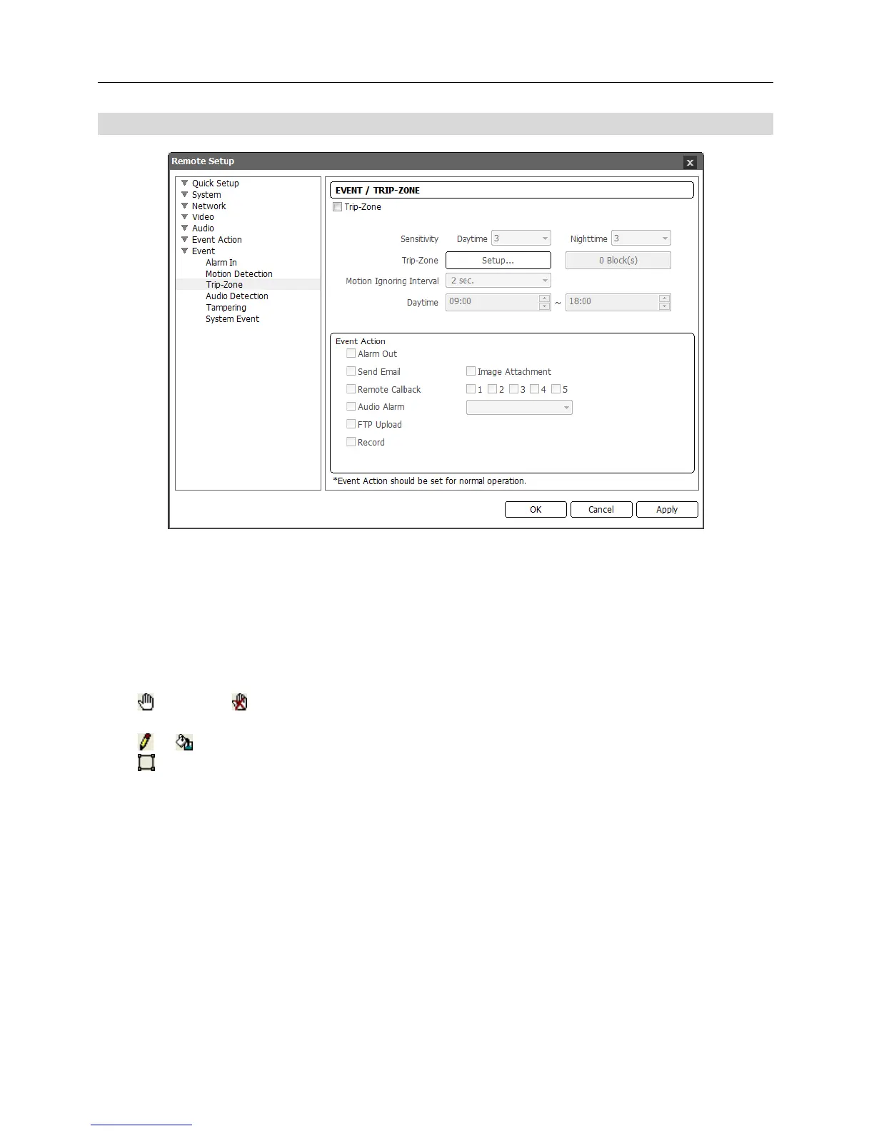 Event Action: Check the box for each action the camera is to take when it detects a trip-zone event.